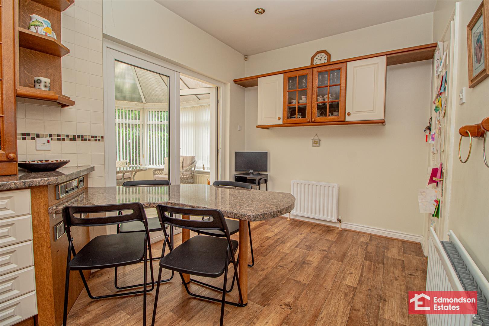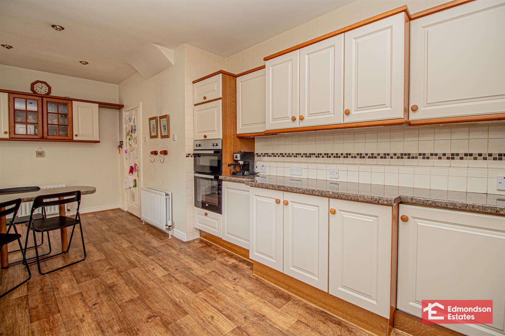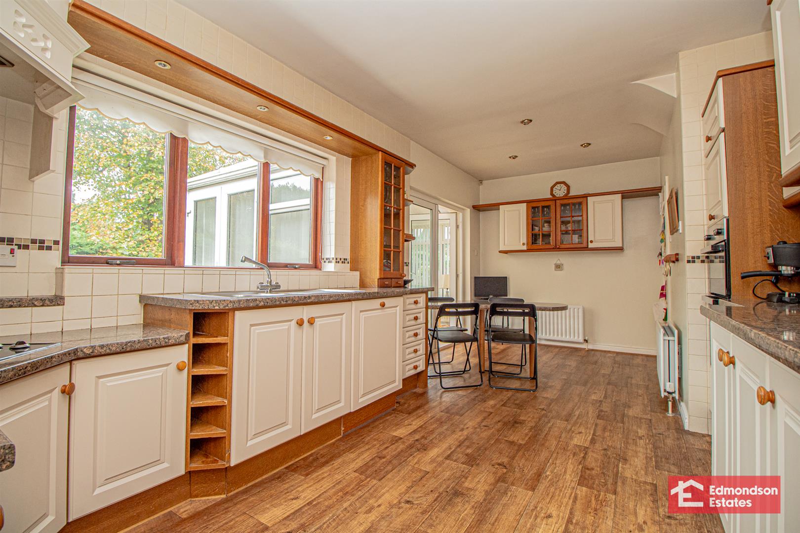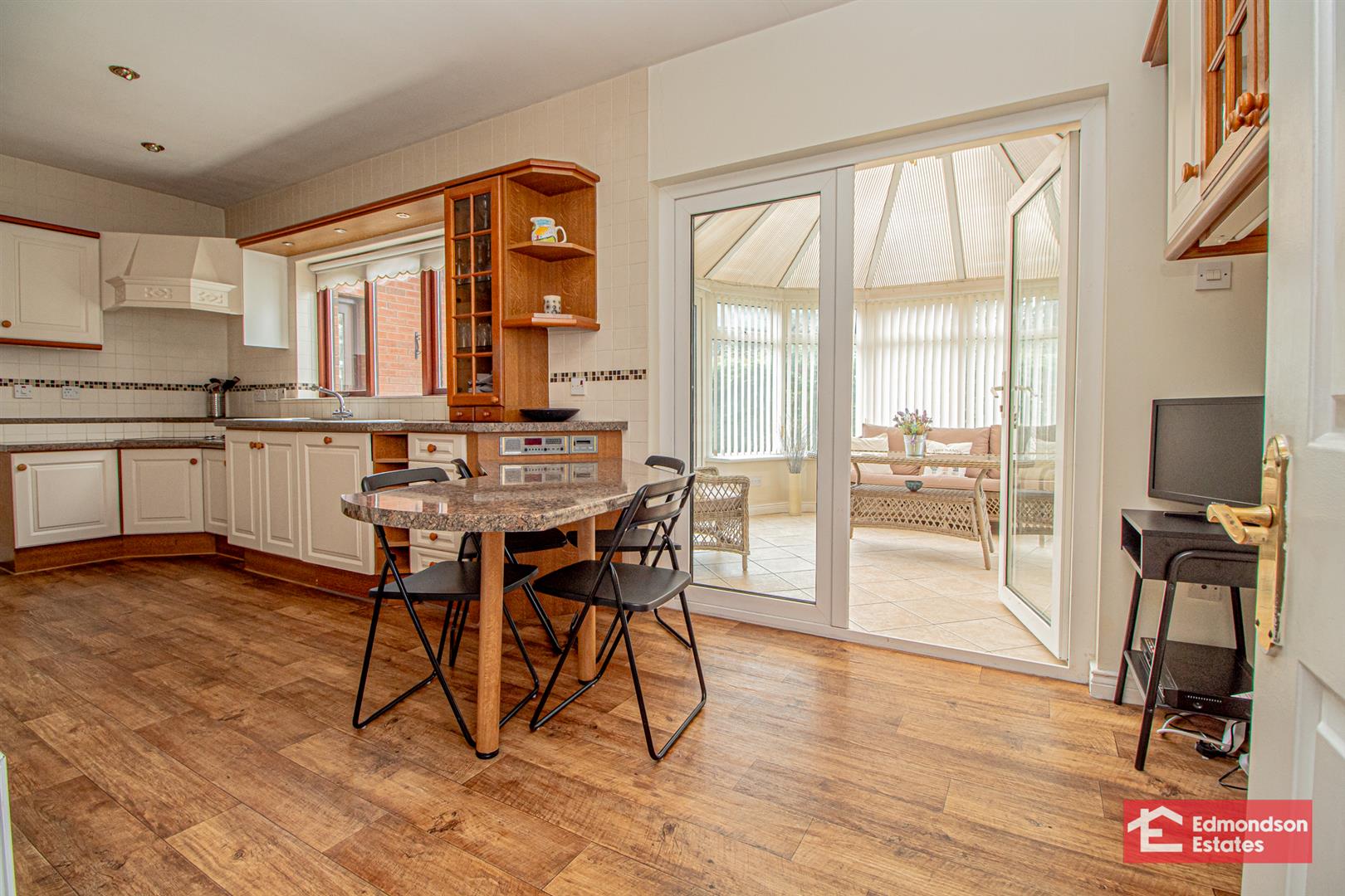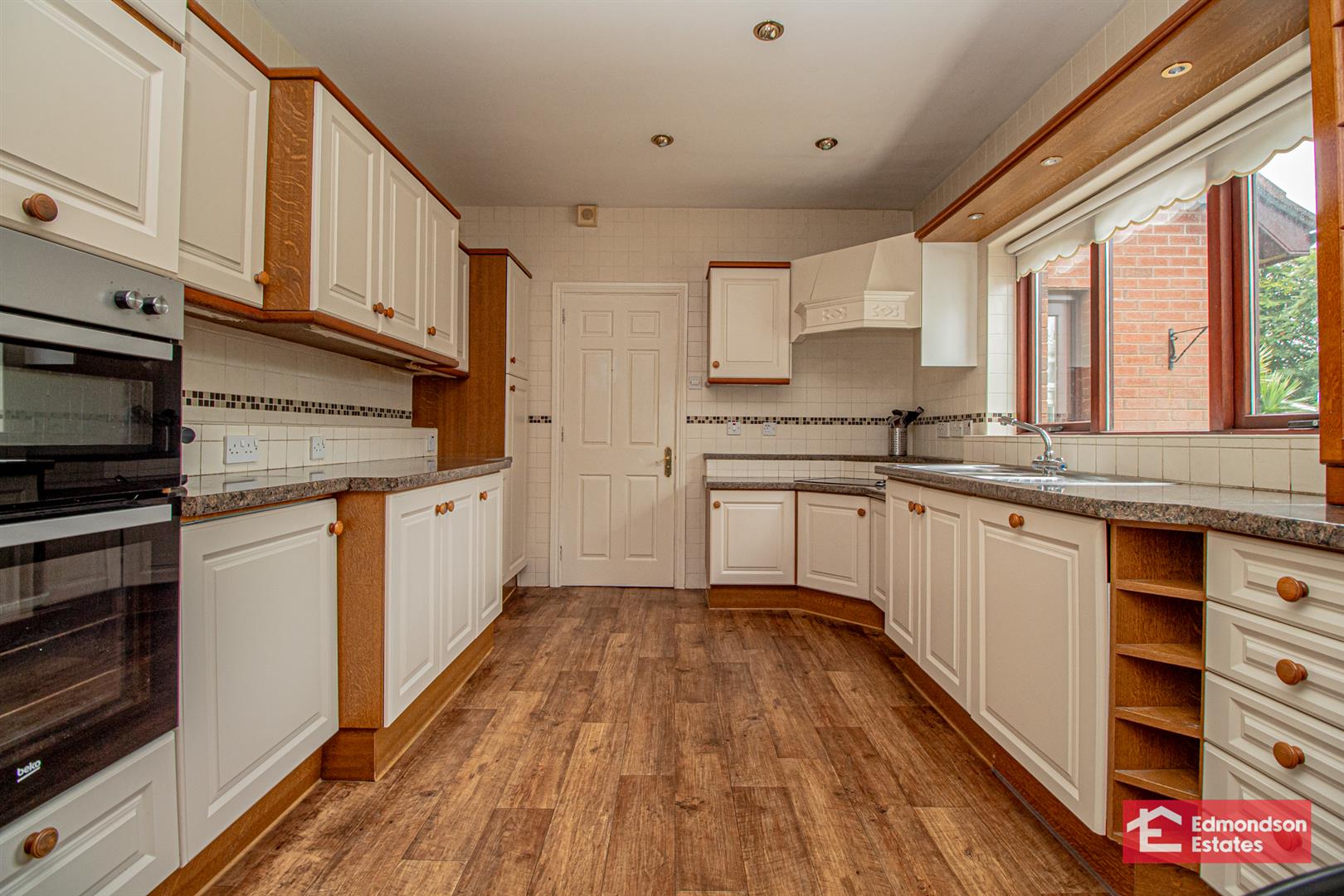 High and low level units with display cabinets. 1 1/2 stainless steel sink. Eye level double oven. Halogen hob. Integrated dishwasher and fridge. Tiled flooring and splashback. Fitted family dining table.