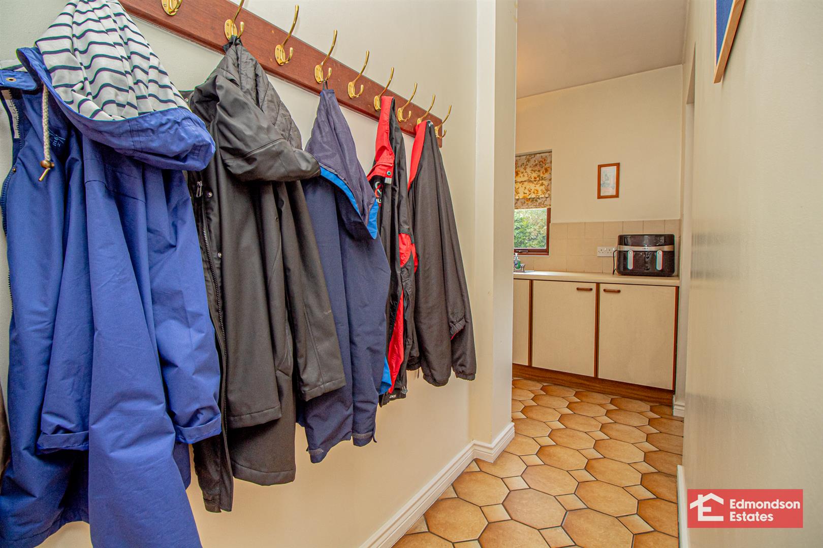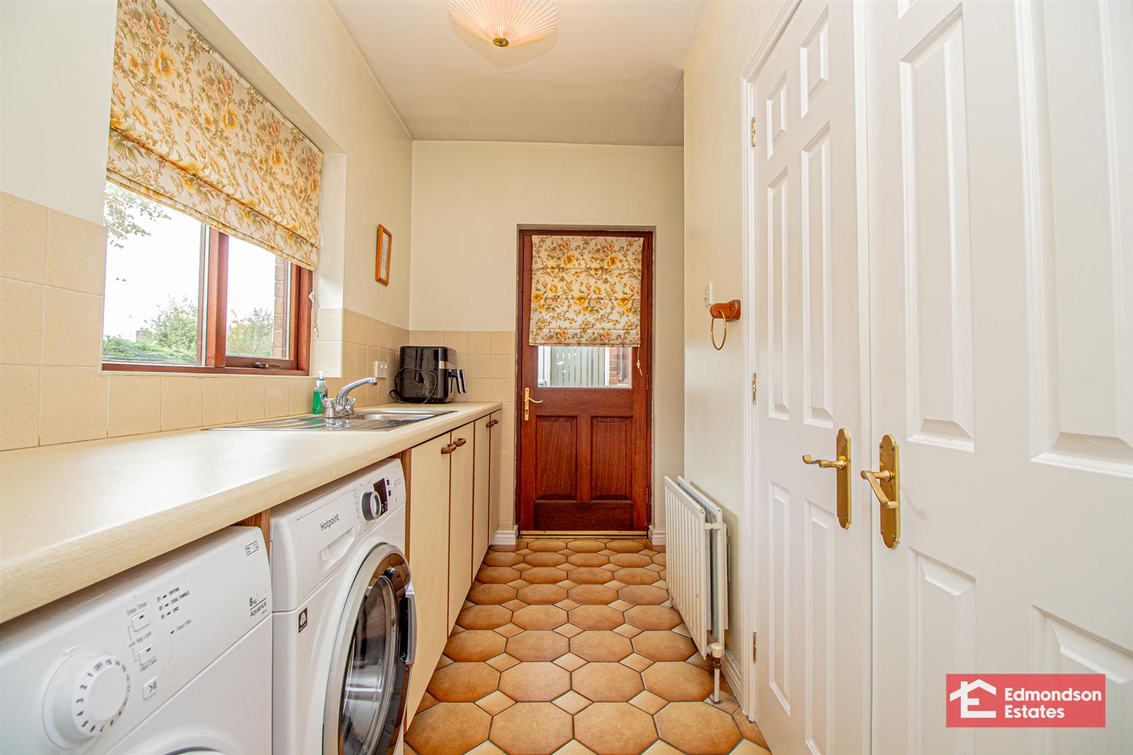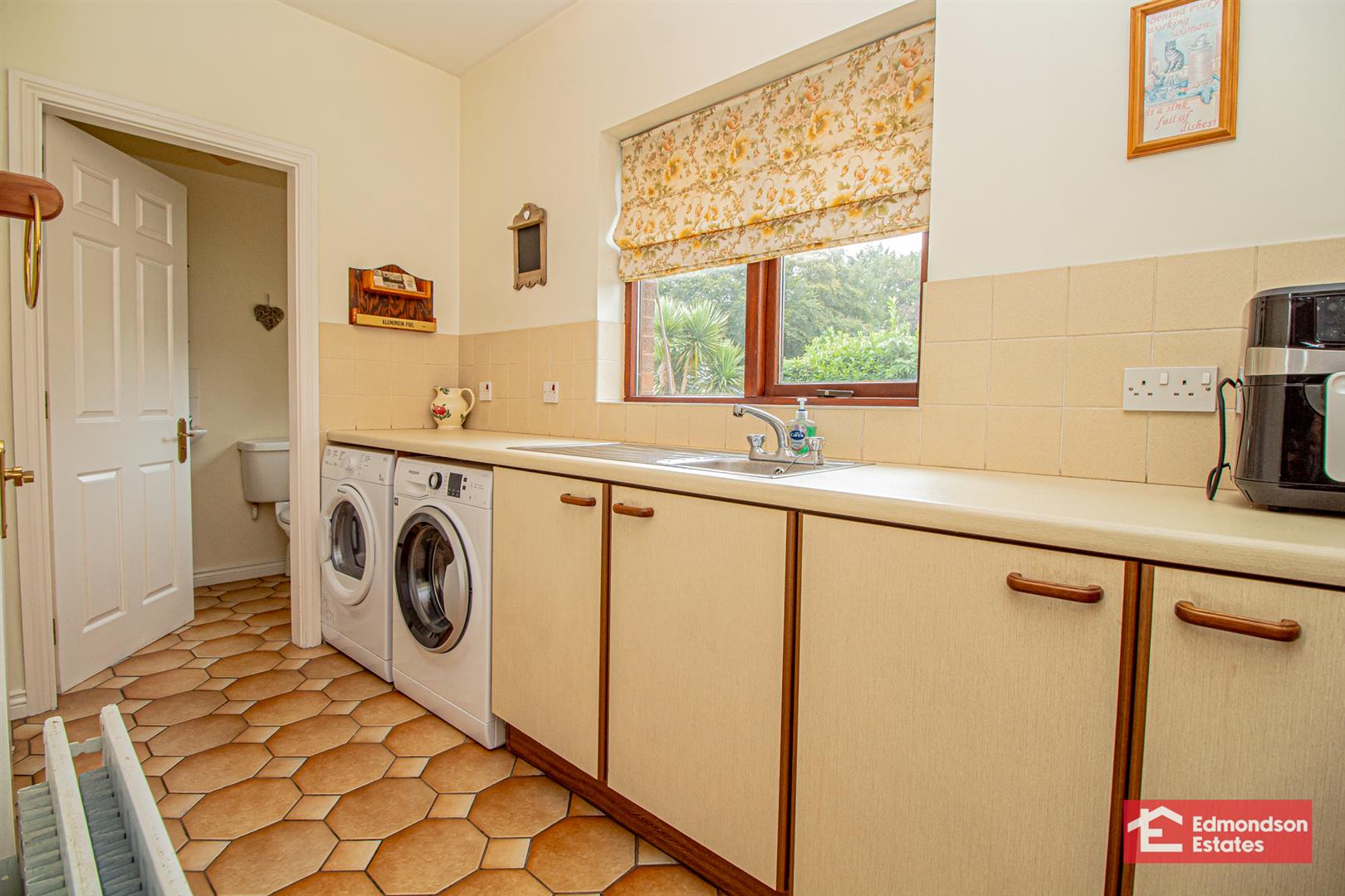 Low level units. Stainless steel sink. Plumbed for washing machine and space for tumble dryer. Double doored store cupboard.
