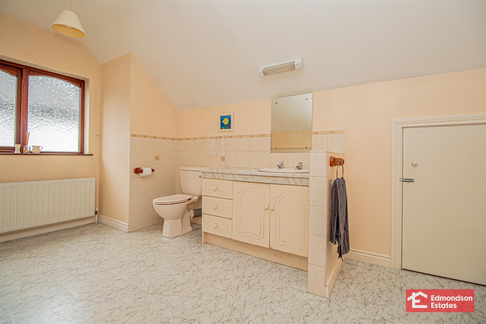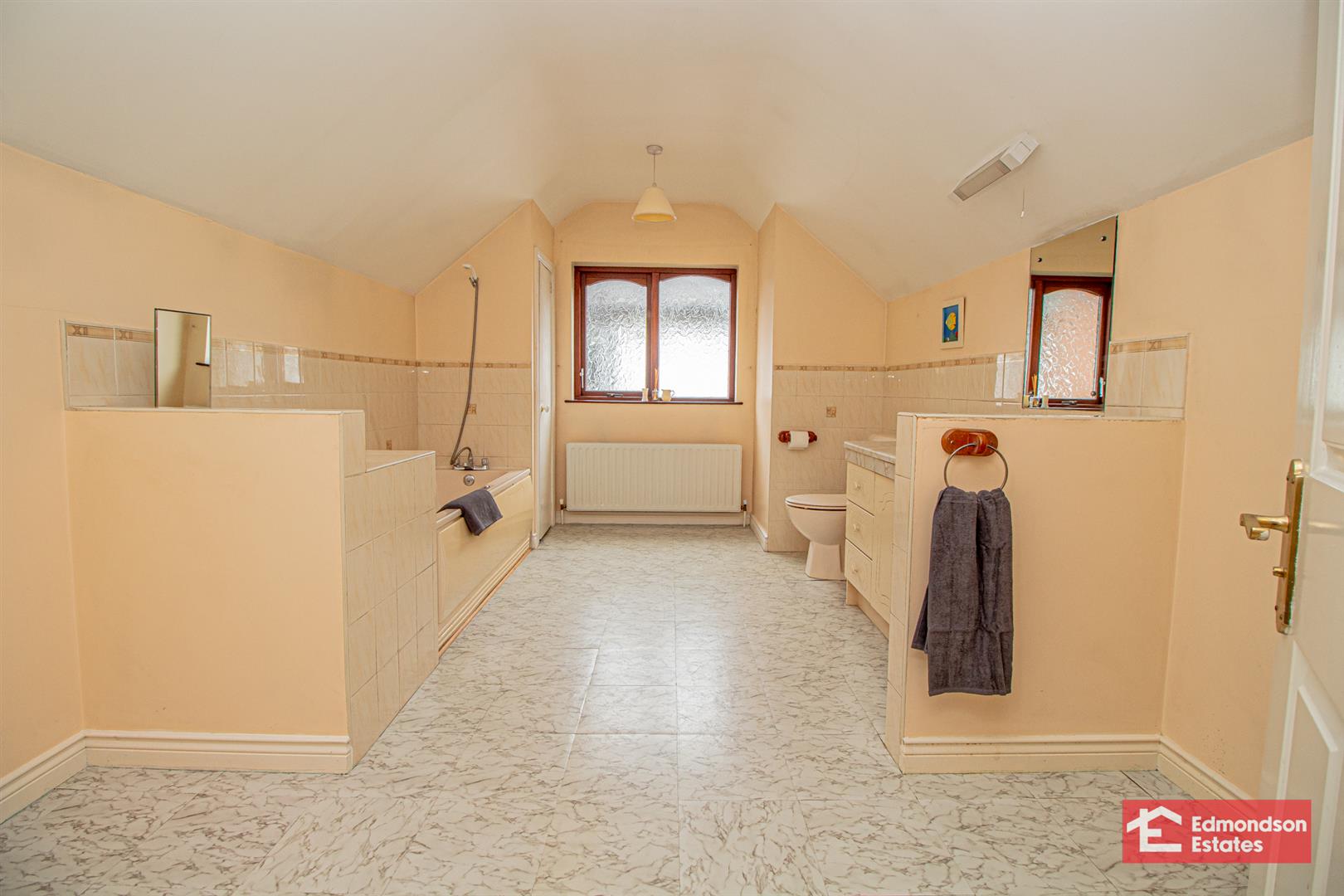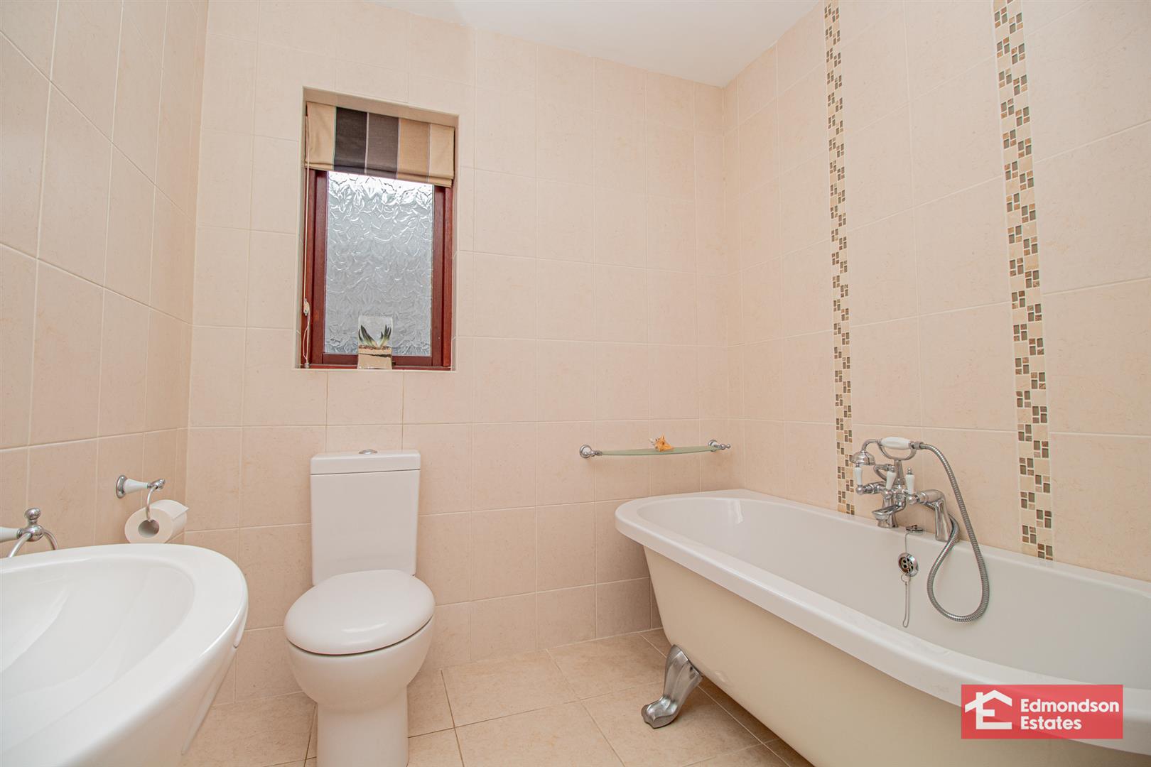 Free standing bath with telephone handle shower head. LFWC and WHB. Large shower unit with electric shower. Fully tiled.