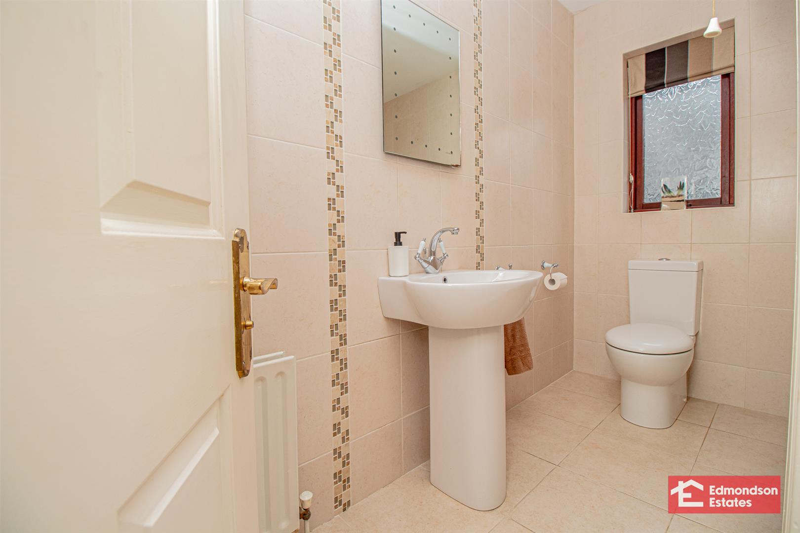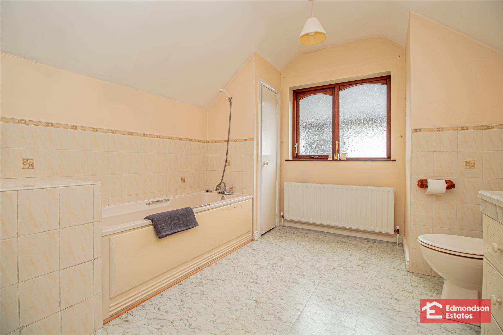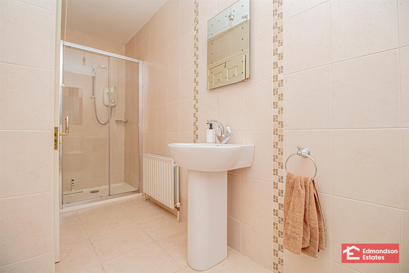 Free standing bath with telephone handle shower head. LFWC and WHB. Large shower unit with electric shower. Fully tiled.