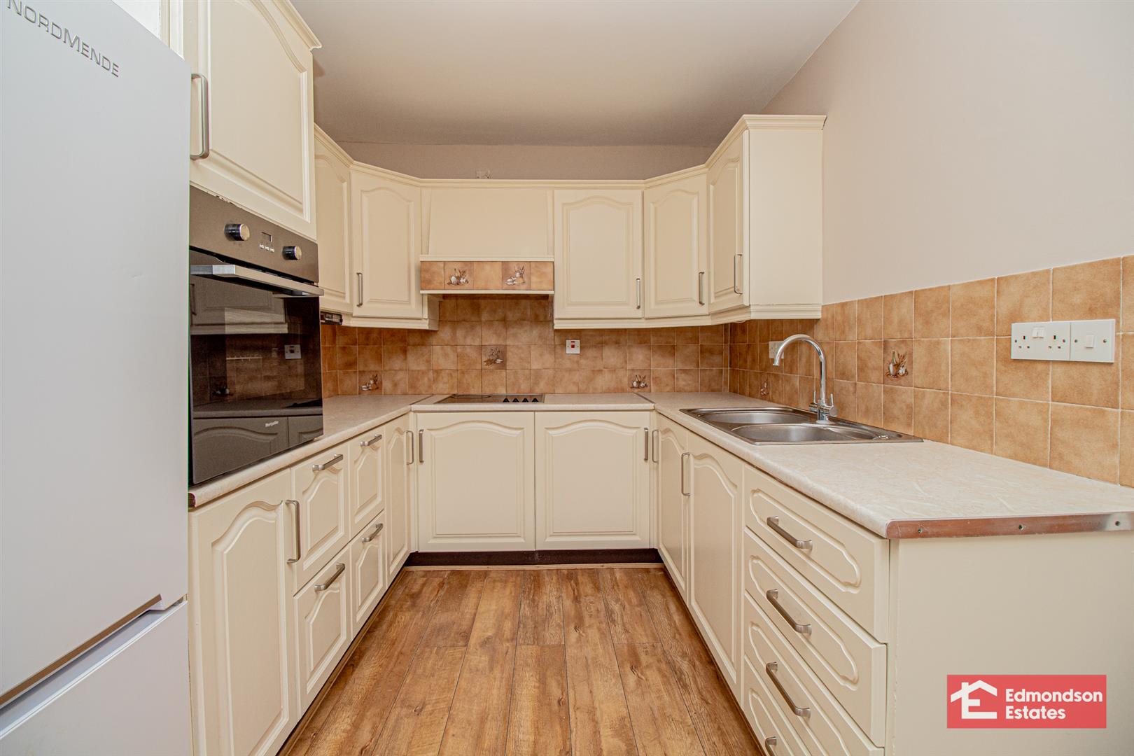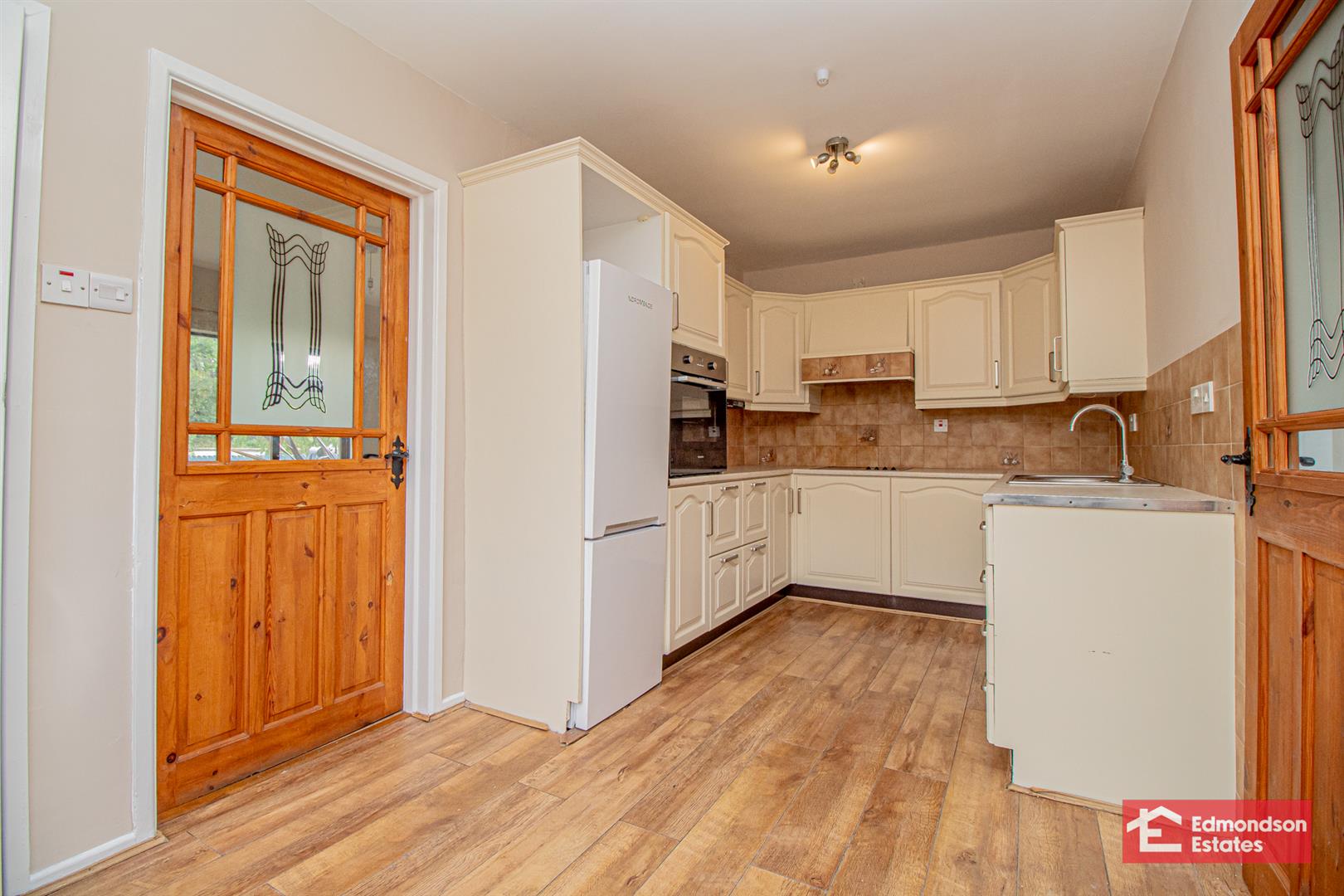 Cream high and low level units. Double stainless steel sink. Halogen hob. New eye level oven. Space for fridge/freezer. Store cupboard with GFCH boiler. Space for family dining table.