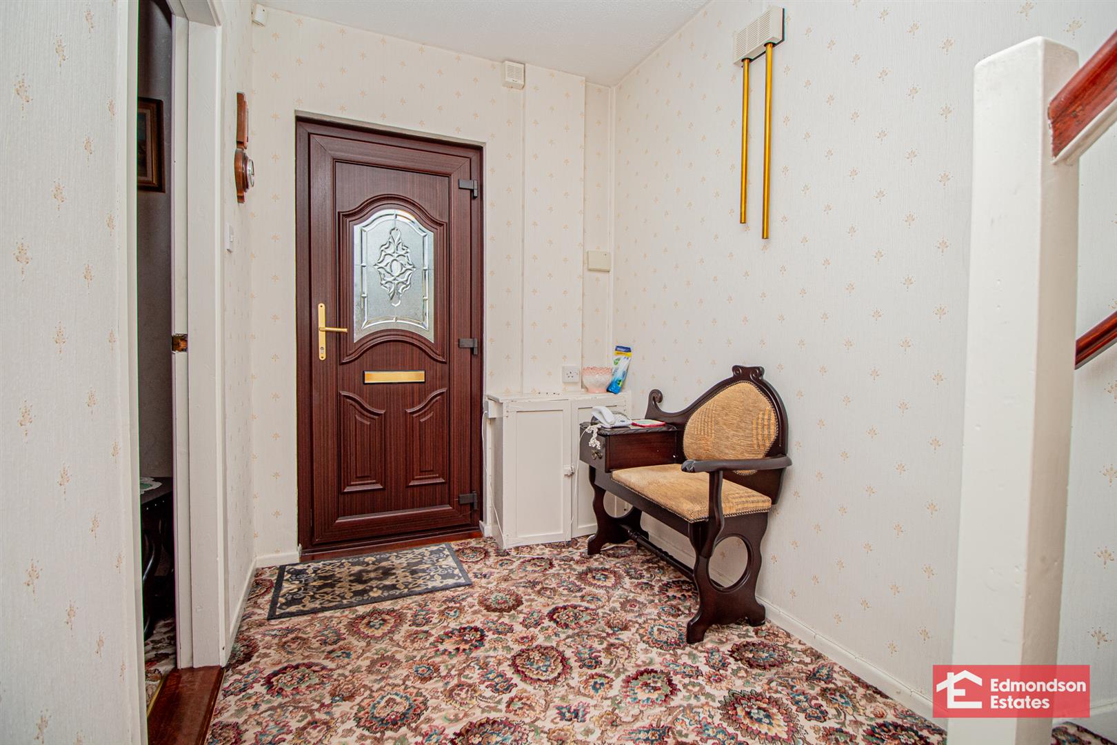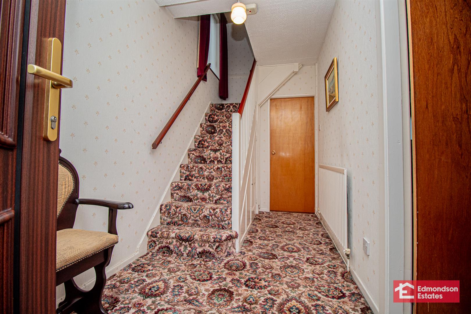 PVC double glazed front door. Stairwell to first floor. Access to under stair store. Alarm panel.