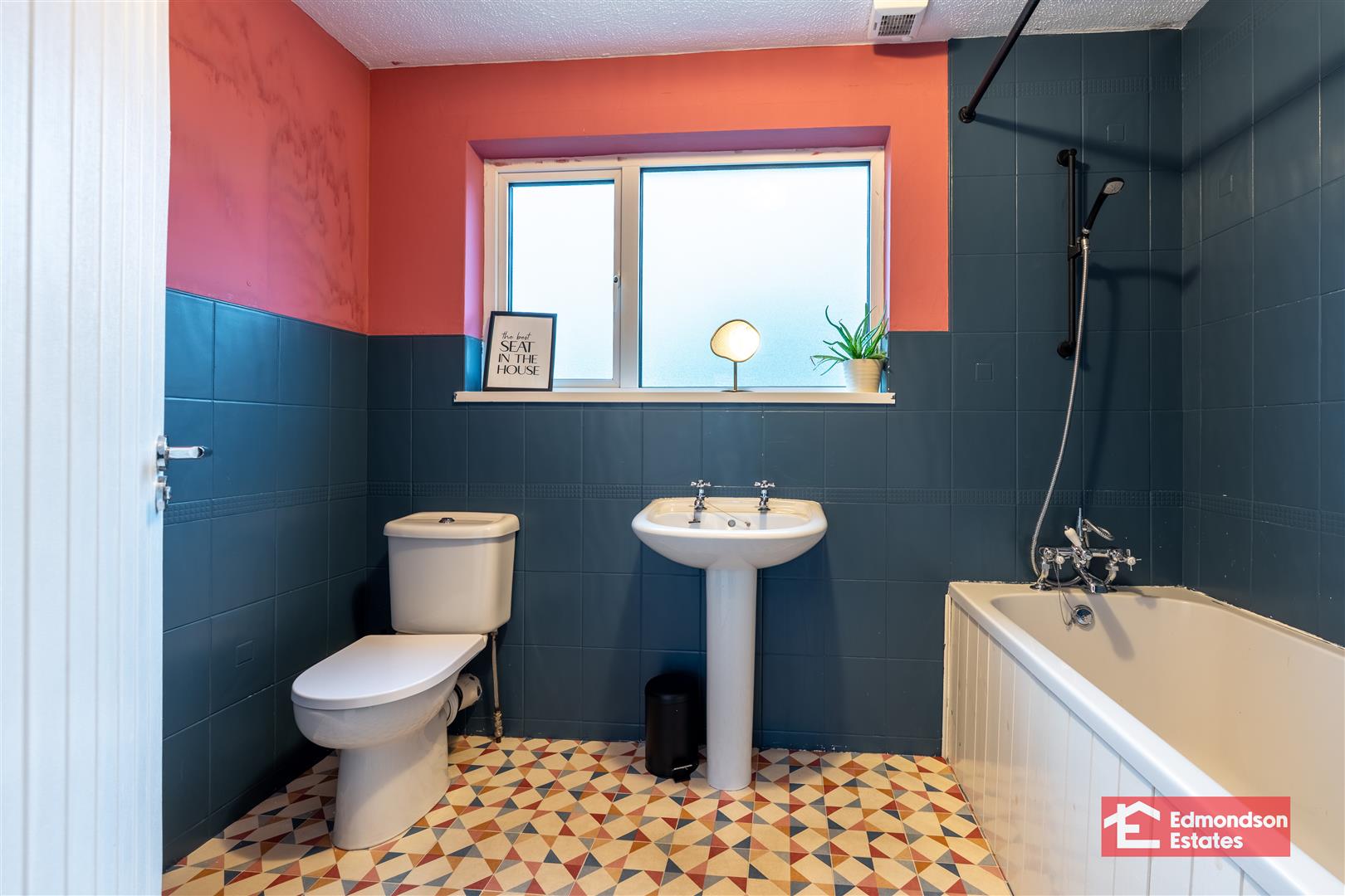 Modern fitted three piece suite comprising panelled bath with electric shower over, wash hand basin and WC. Part tiled walls.