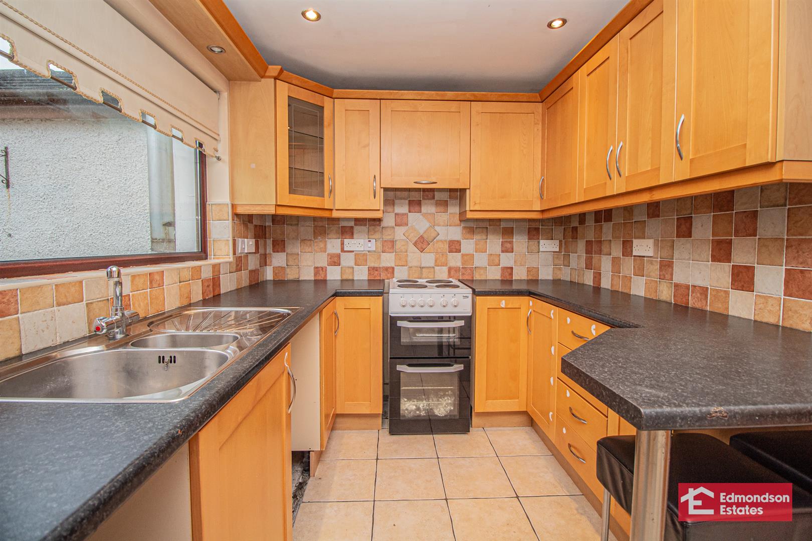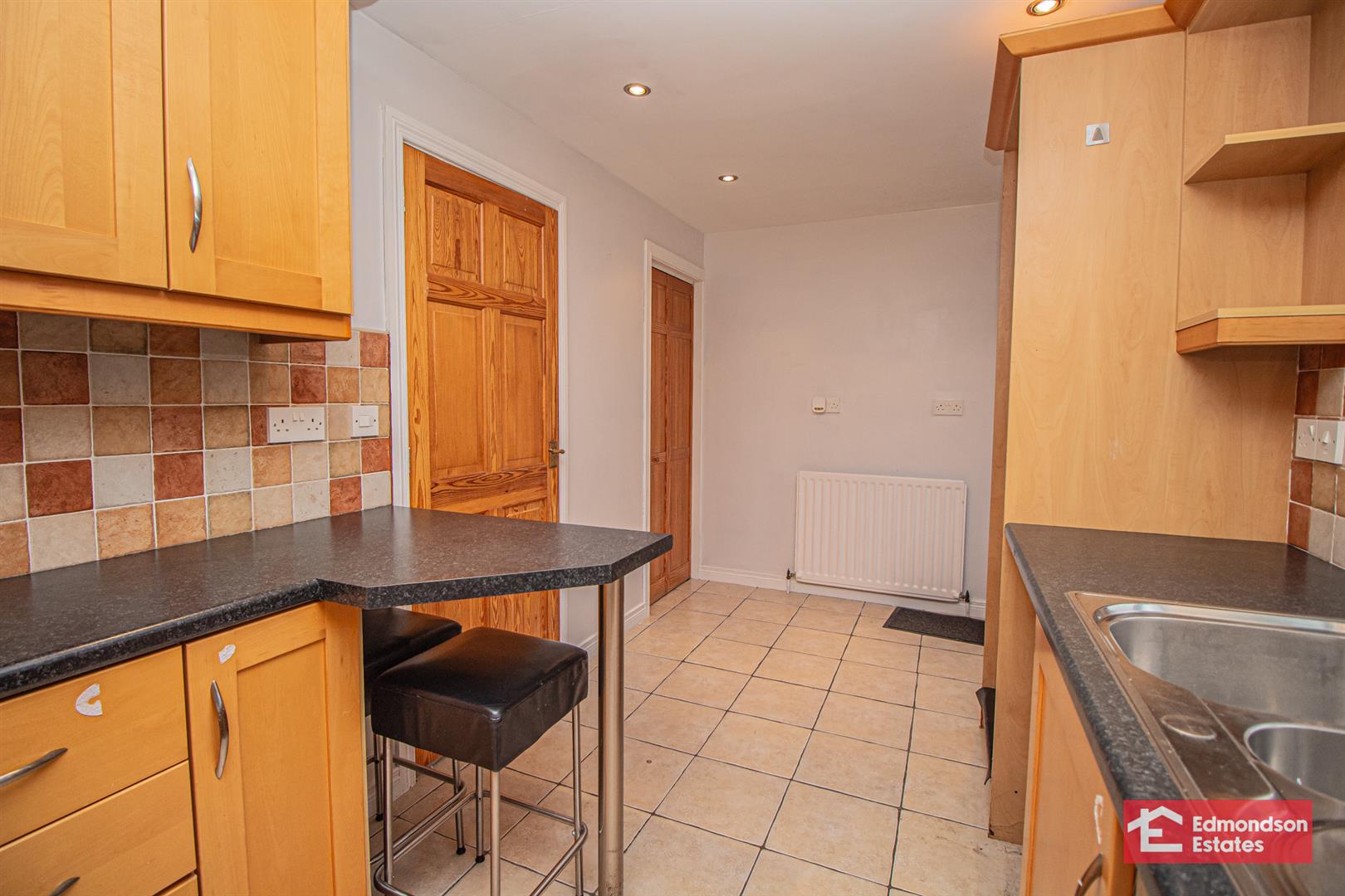 Modern fitted kitchen with high and low level storage units and work surface. Cooker. Stainless steel sink unit. Space for fridge freezer, washing machine and dishwasher. Breakfast bar area. Part tiled walls. Access to under stair store.