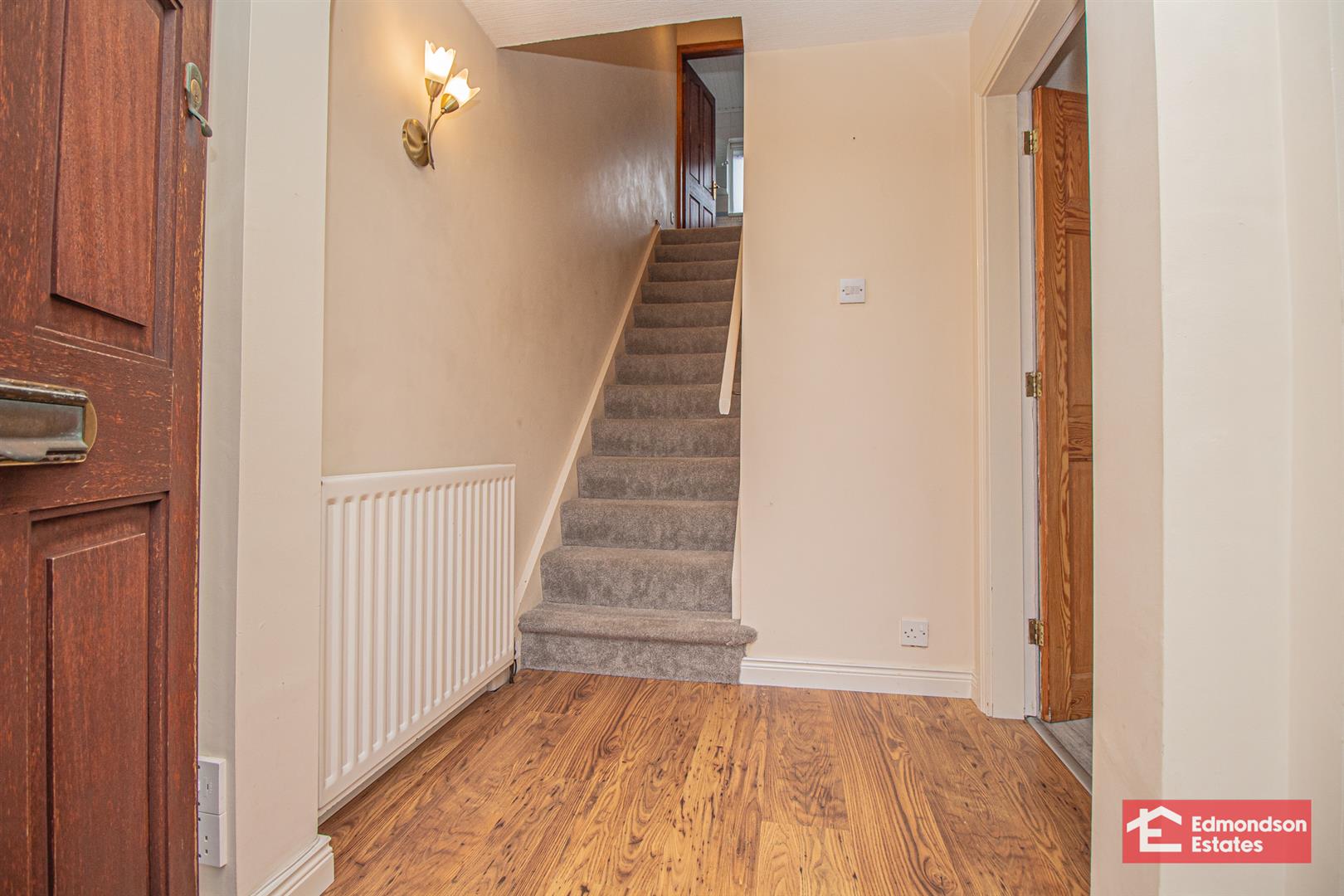 Hardwood front door with side screens. Wood laminate floor covering. Stairwell to first floor.