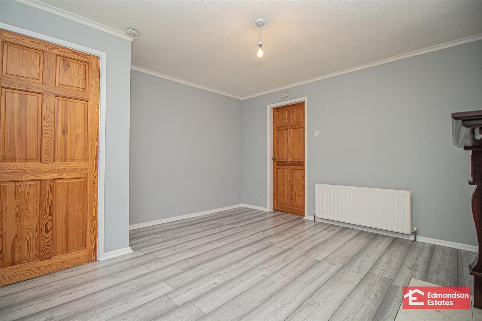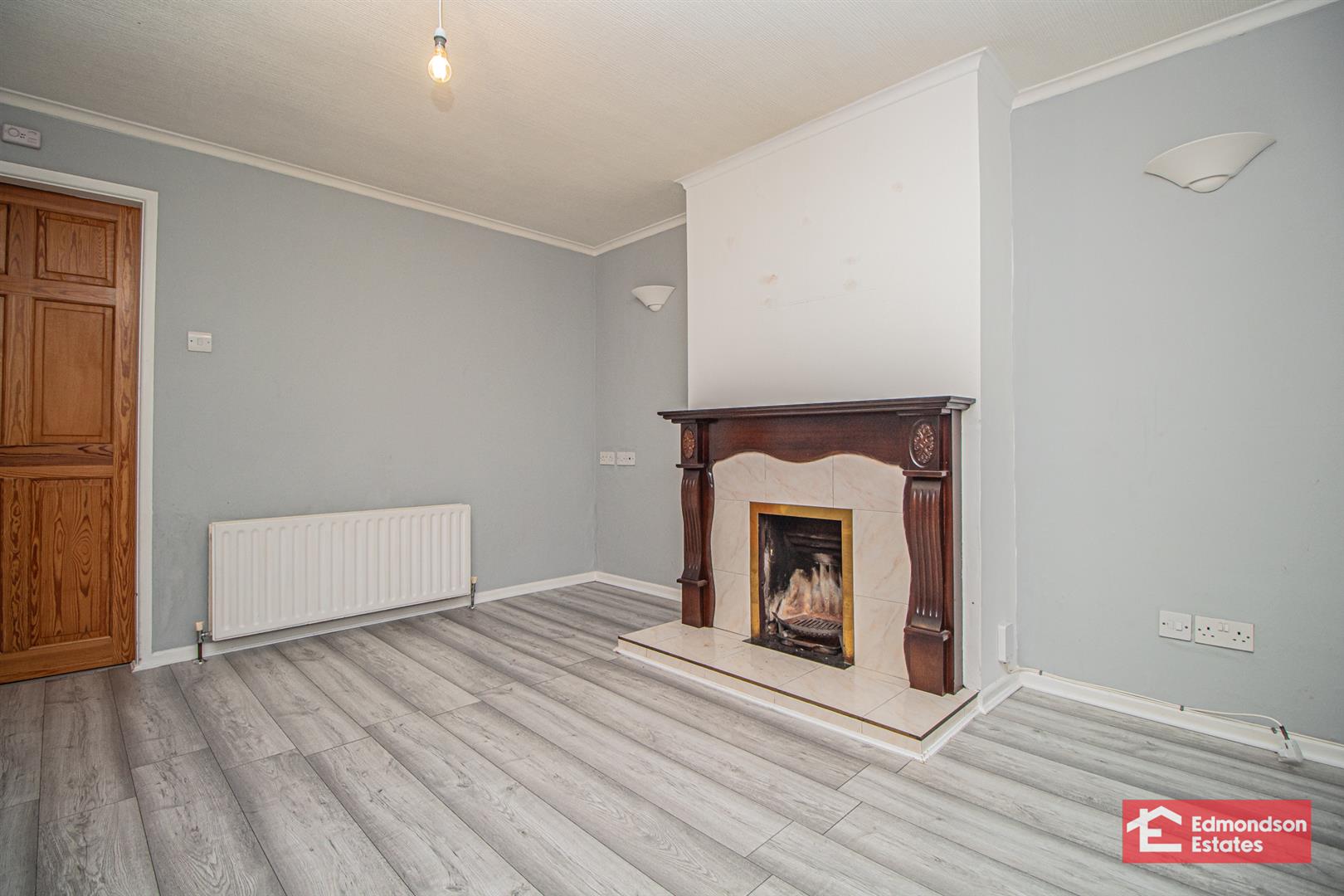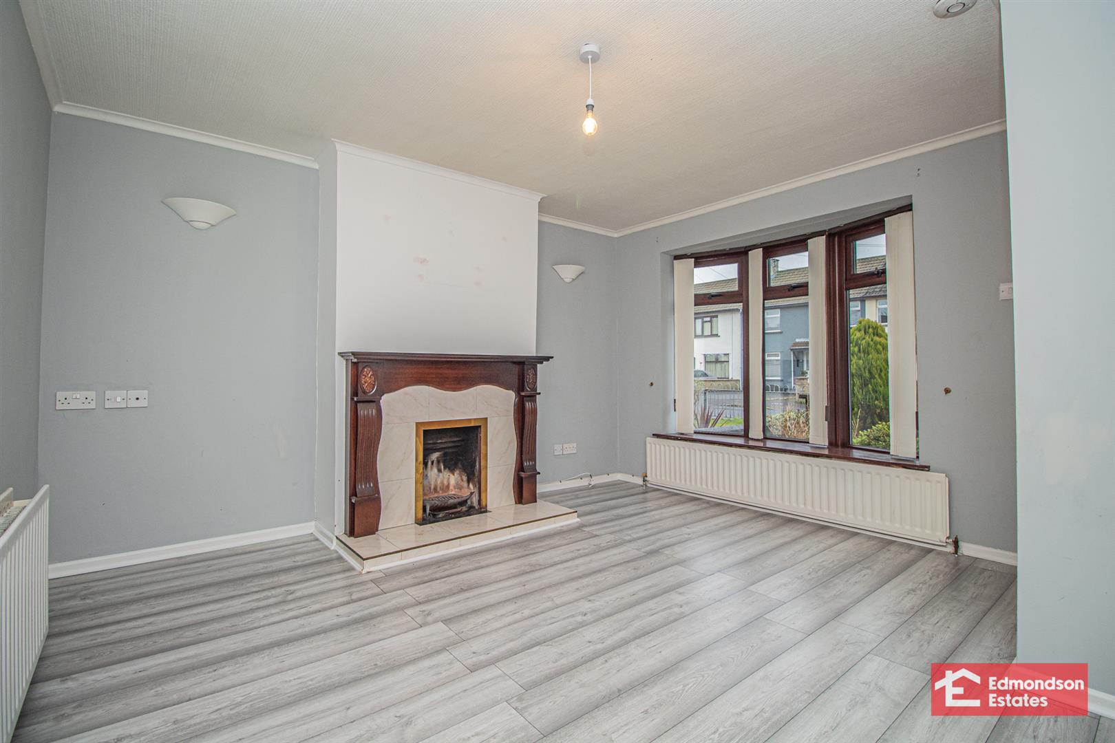 Wood laminate floor covering. Focal point open fire. Bow bay window.