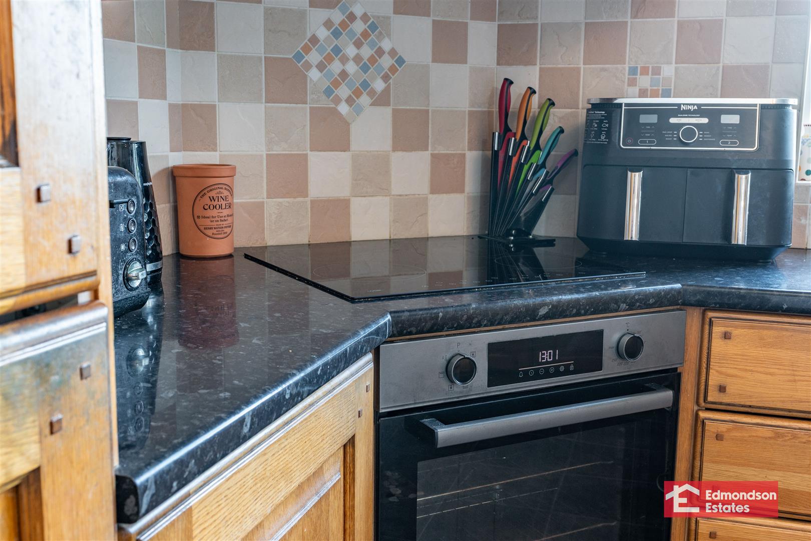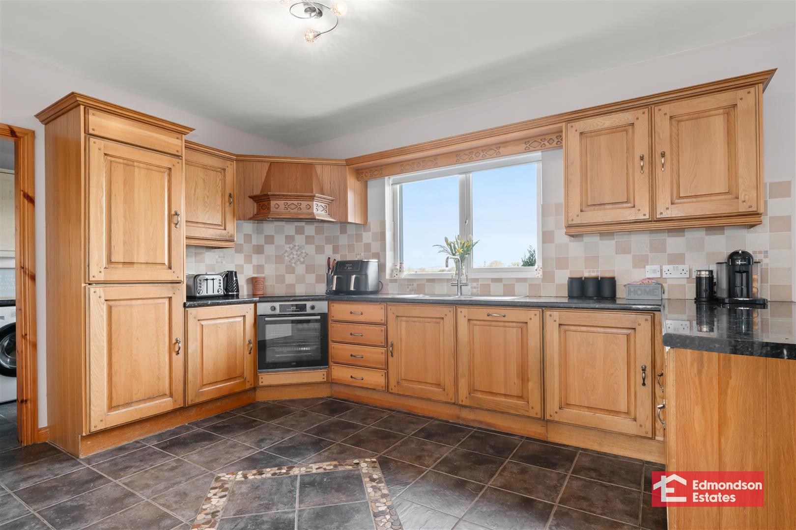 Oak high and low level units. Halogen hob within corner inglenook, and electric oven. 1 /12 stainless steel sink. Integrated dishwasher and fridge/freezer. Tiled flooring and splashback.