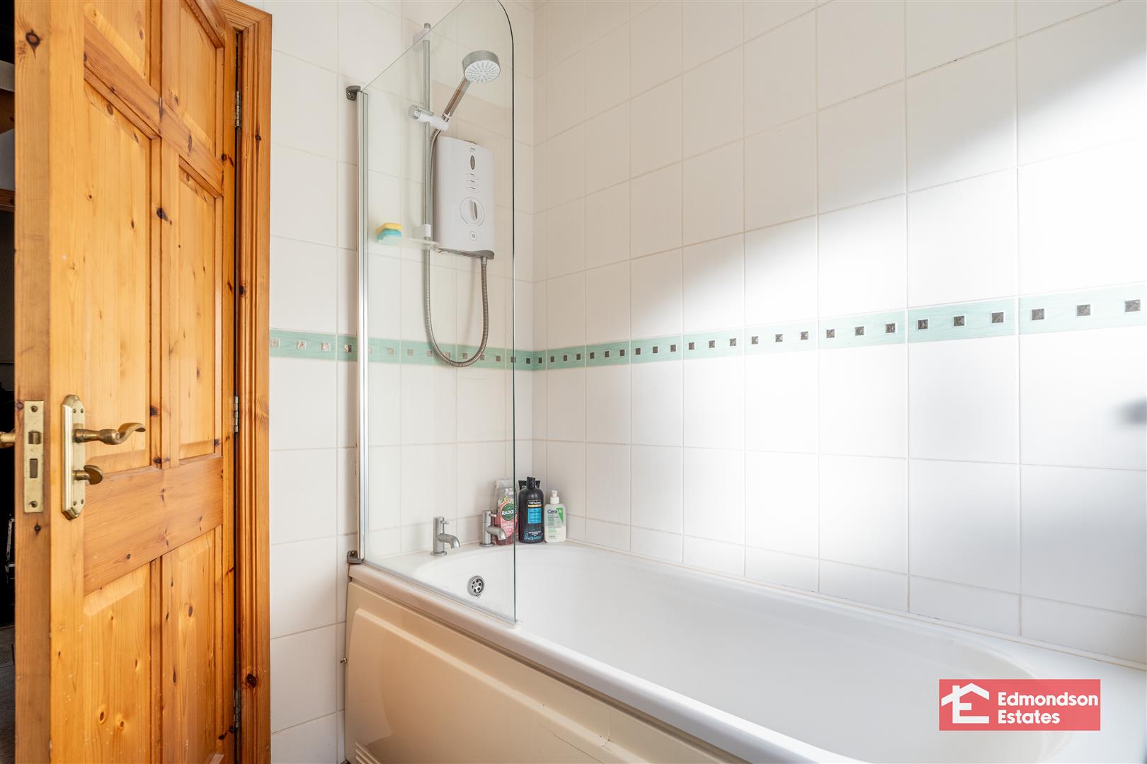 WC and WHB. Bath. Tiled walls.