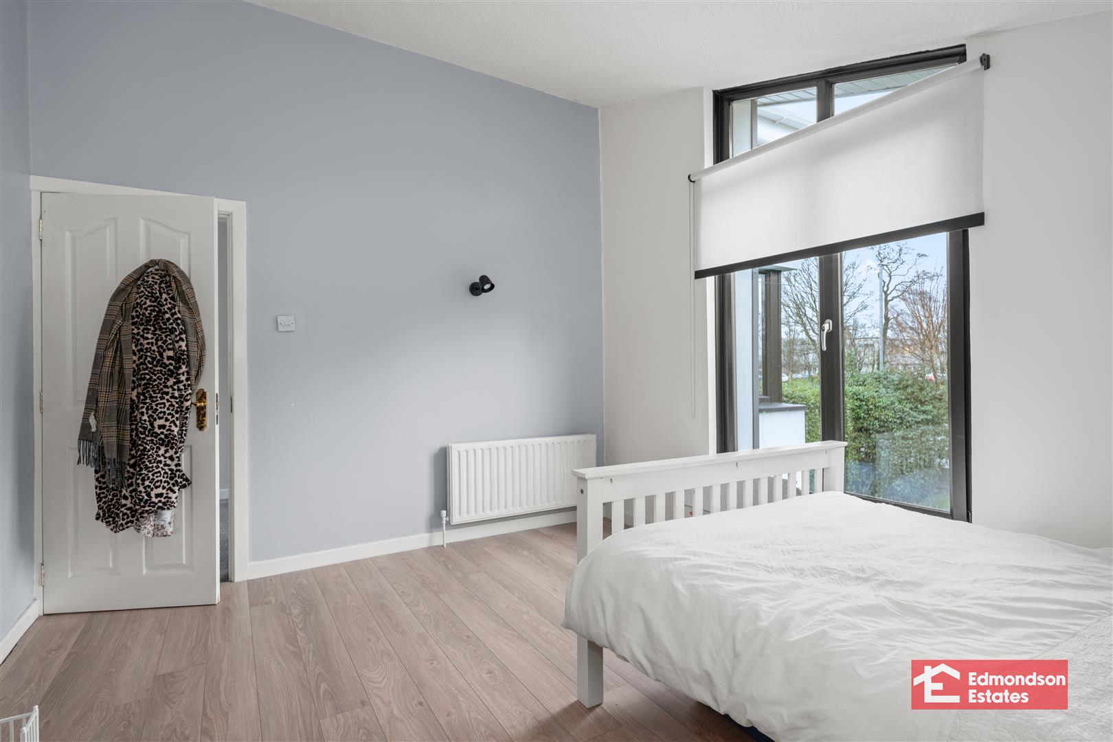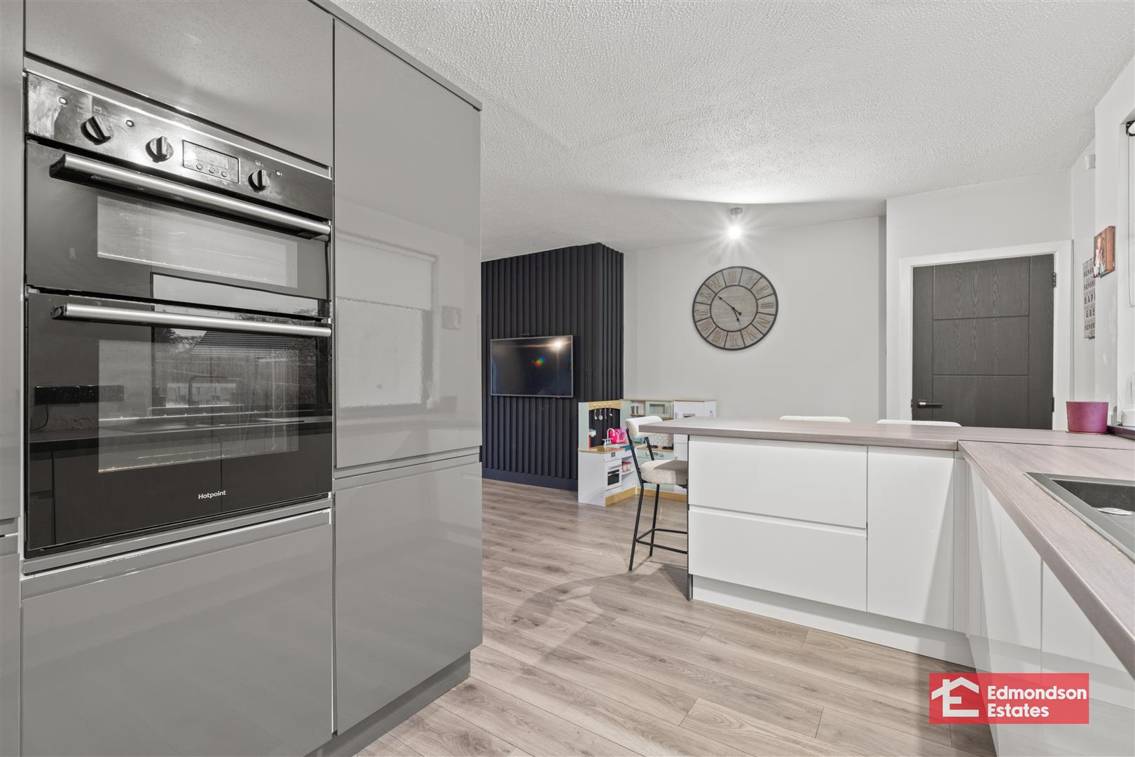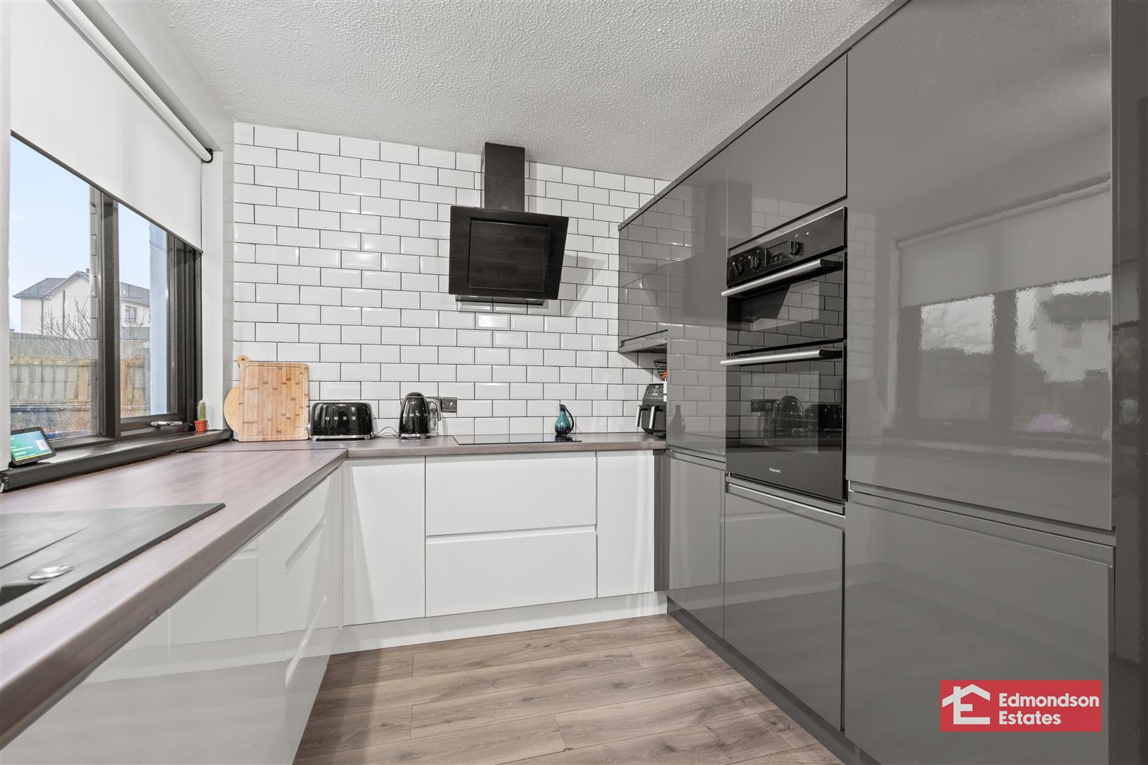 widest points. Recently fitted modern high gloss kitchen with high and low level storage units and work surfaces. Integrated appliances to include fridge freezer, eye level grill and oven, dishwasher and 4 ring induction hob with extractor fan over. Composite sink unit. Breakfast bar area. Dual aspect windows. Part tiled walls. Wood laminate floor covering.