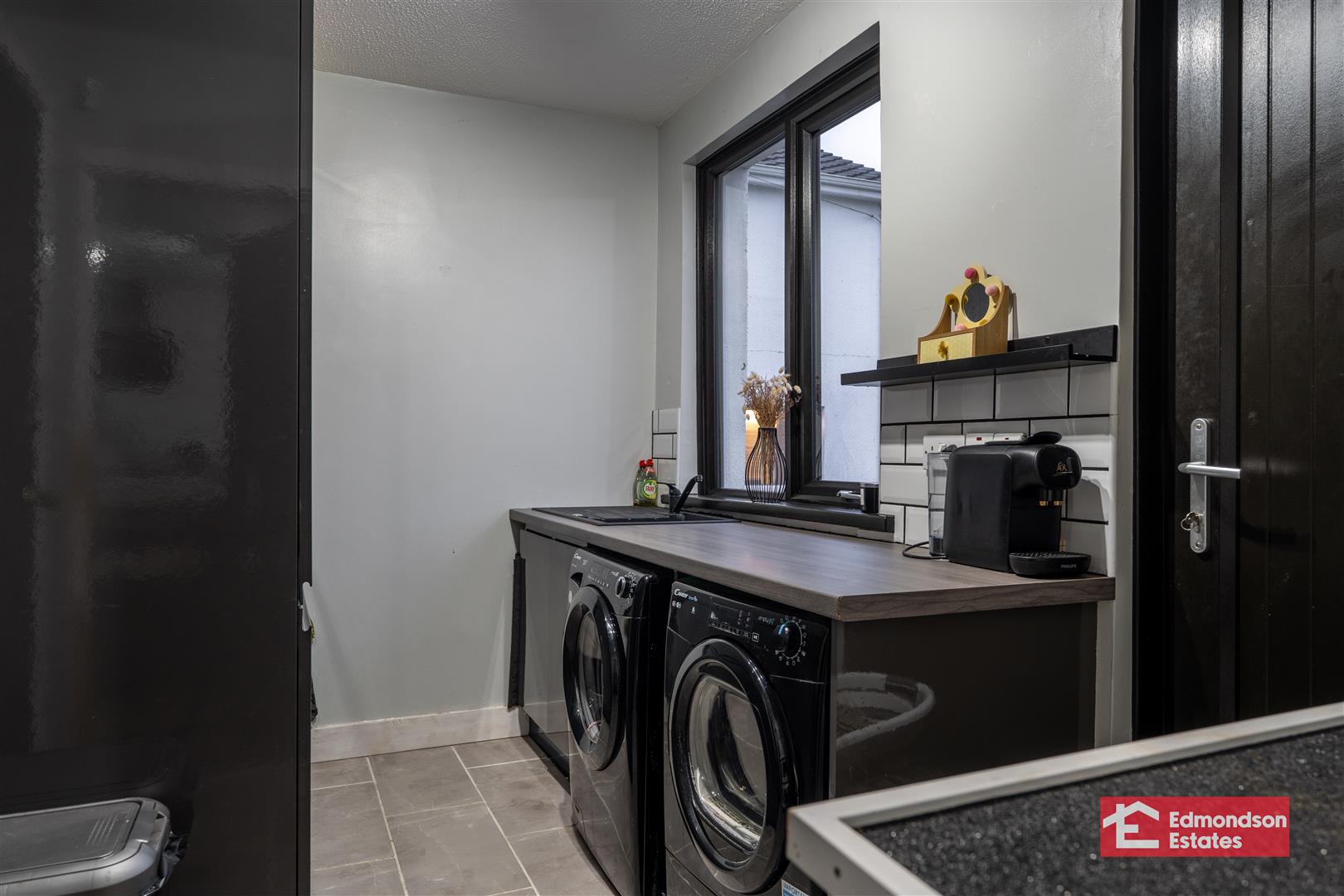 High and low level storage units and work surface. Composite sink unit. Part tiled walls and tiled floor. PVC rear door. Internal hardwood door to garage.