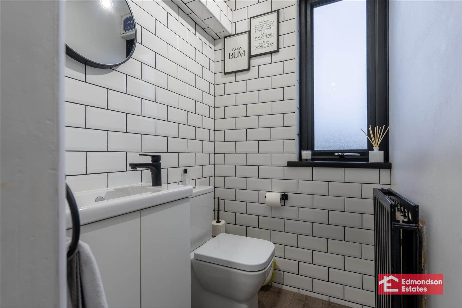 Modern fitted two piece suite comprising vanity unit and WC. Fully tiled walls and tiled floor. Cloakroom area.