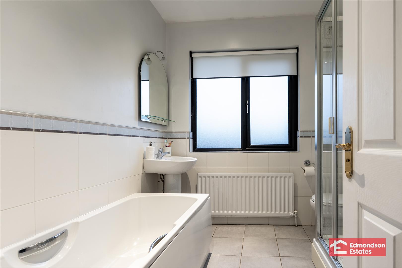 Modern fitted four piece suite comprising panelled bath, shower cubicle with electric shower over, wash hand basin and WC. Part tiled walls and tiled floor. Access to store.