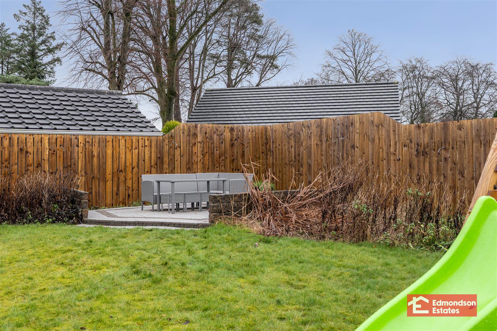 Generous rear garden in lawn with twin paved patio areas and separate raised composite decking area.