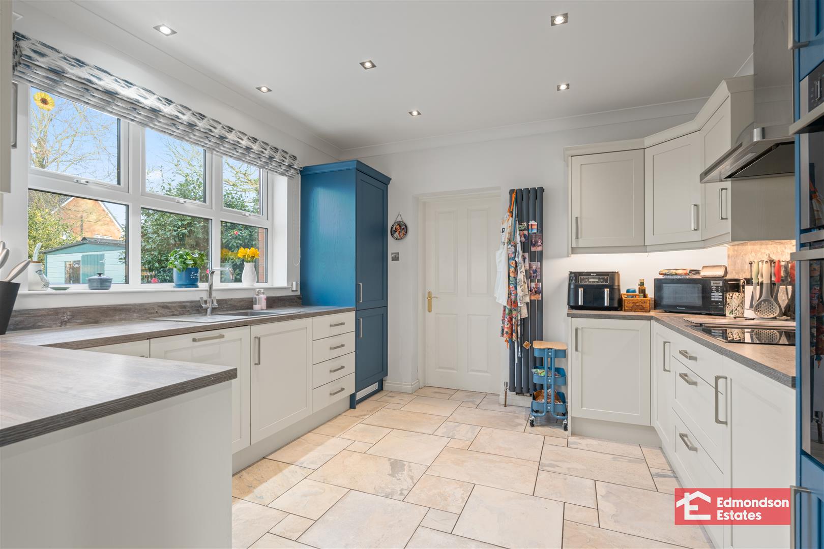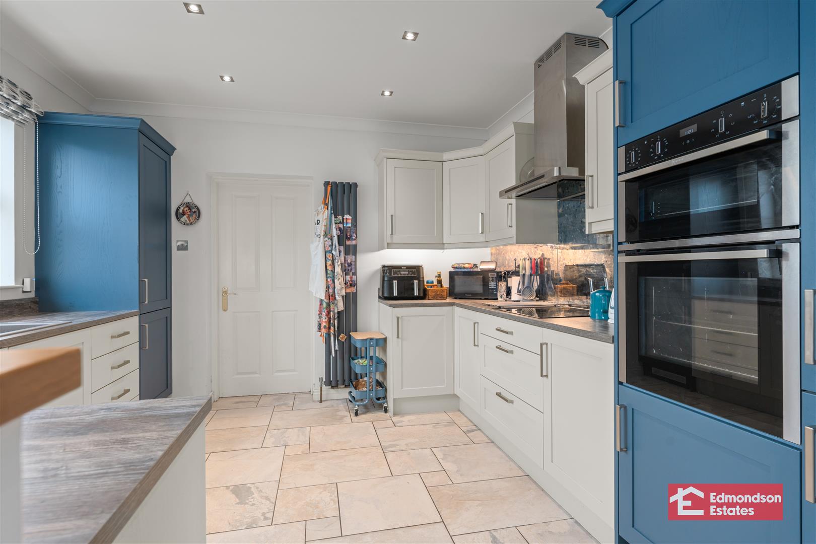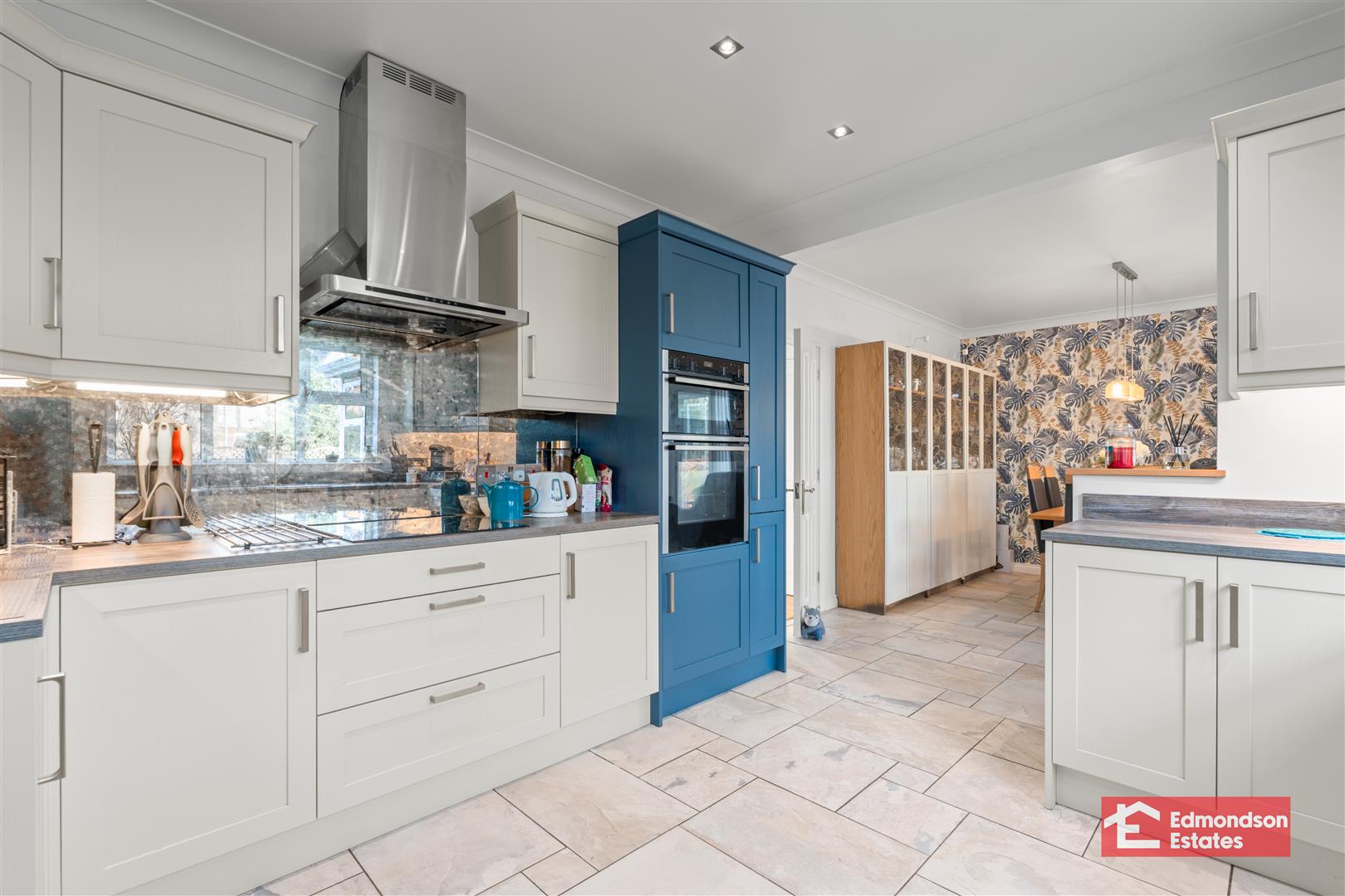 Refitted high and low level wall units. Grey sink. Induction hob. Eye level oven/grill. Integrated fridge/freezer. Integrated dishwasher. Tiled flooring.