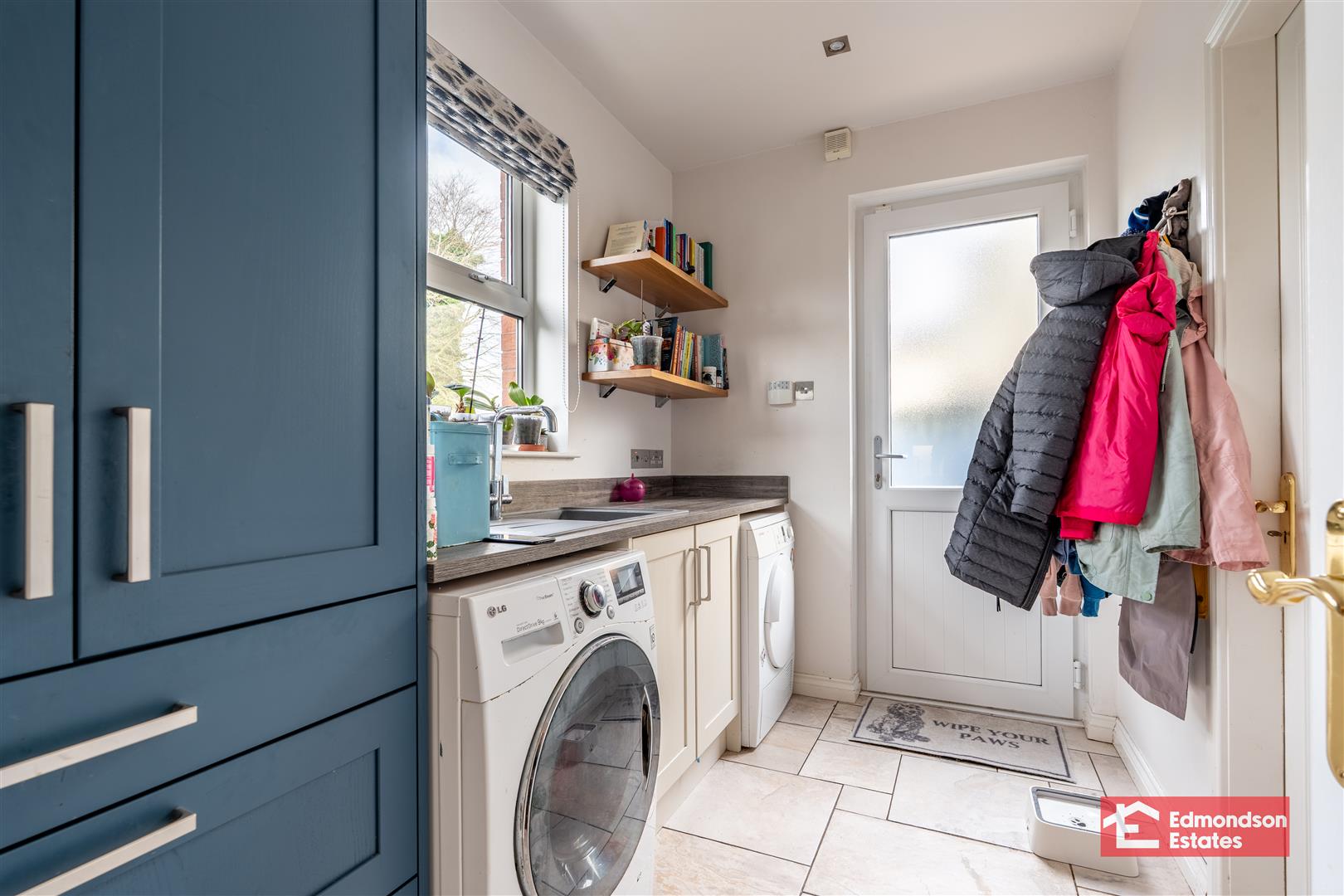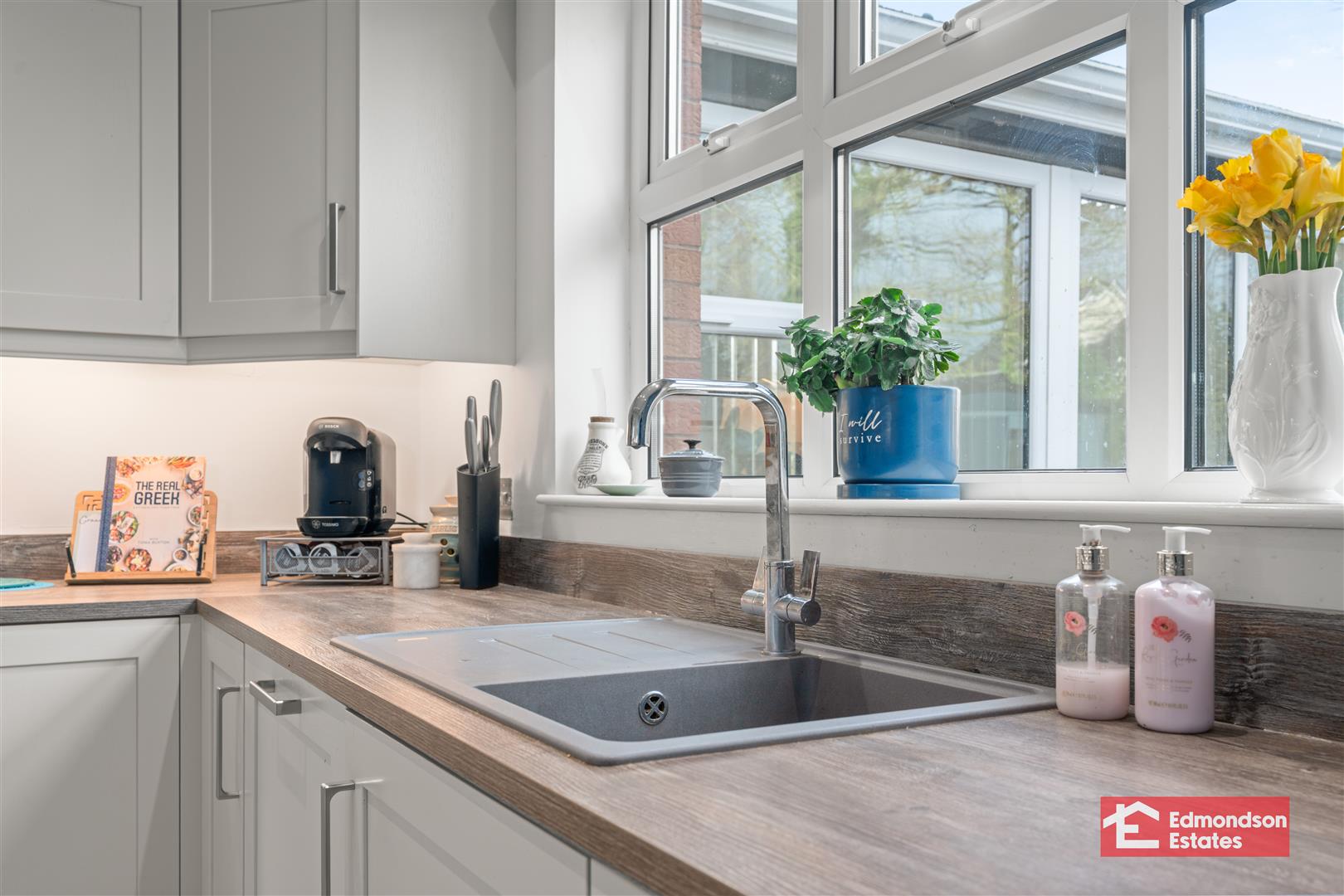 High and low level units. Grey sink. Plumbed for washing machine and space for tumble dryer.