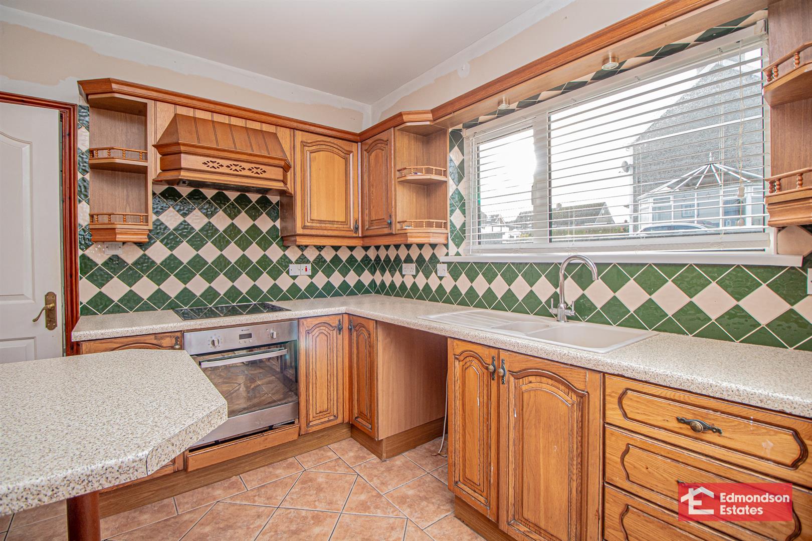 Fitted kitchen with high and low level storage units and work surfaces. Composite 1.5 bowl sink unit. Breakfast bar. Integrated 4 ring hob and oven with extractor fan over. PVC double glazed rear door. Part tiled walls and tiled floor.