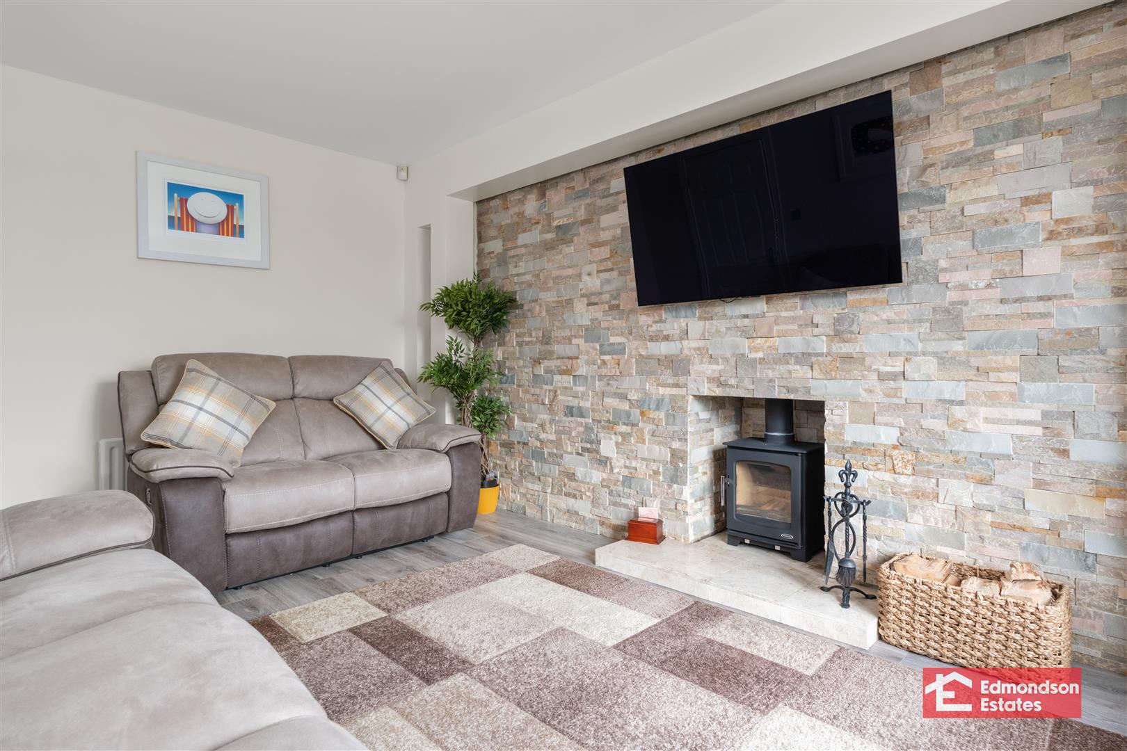 Focal point wood burning stove in Inglenook style recess. Wood laminate floor covering.