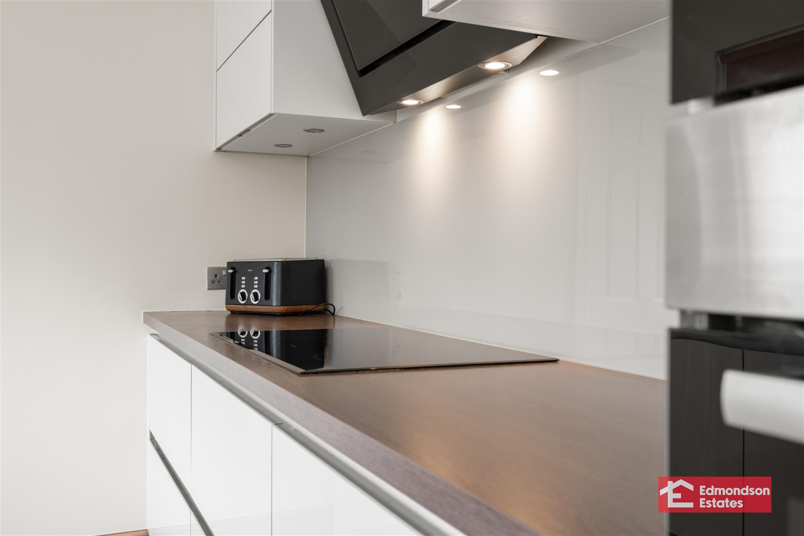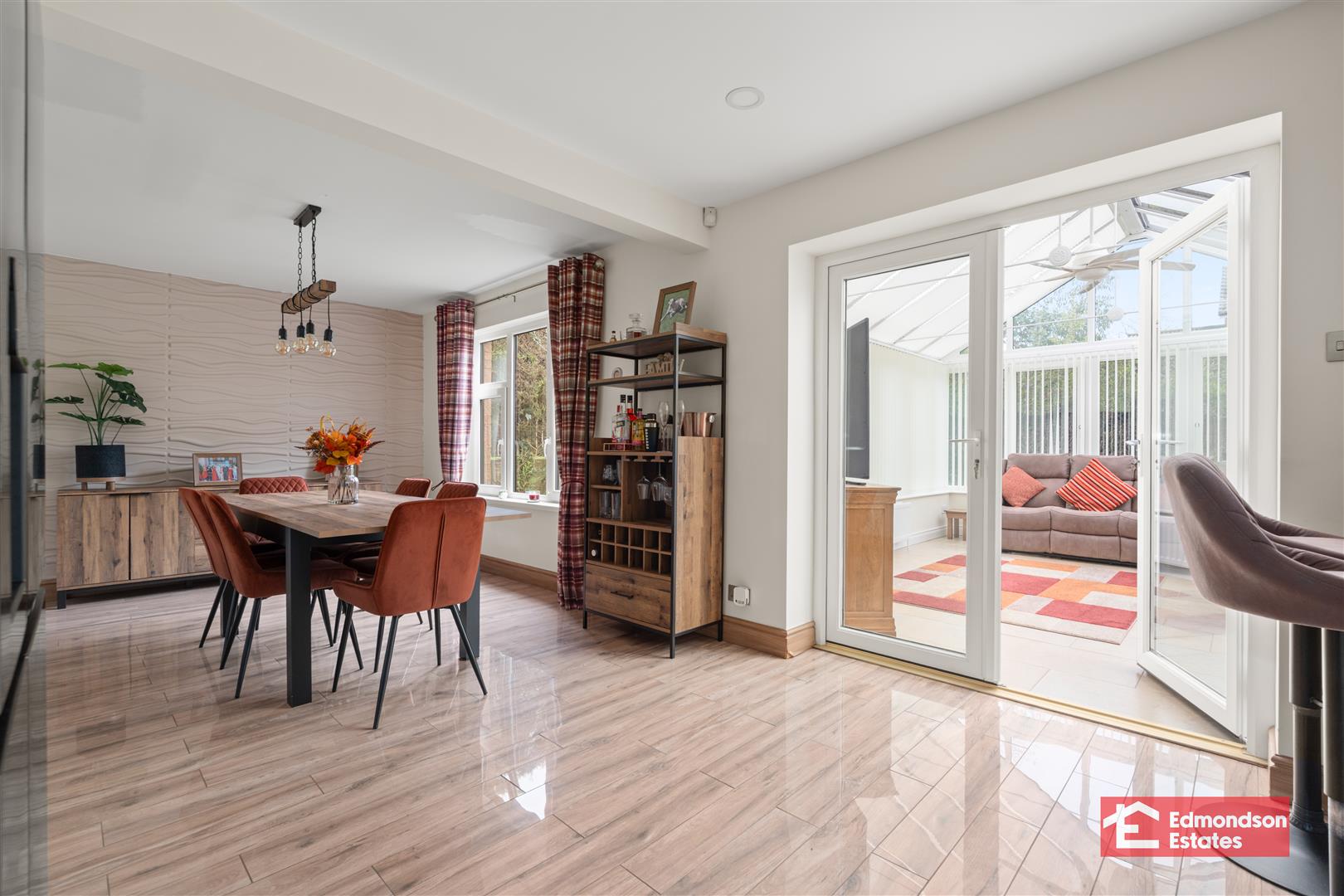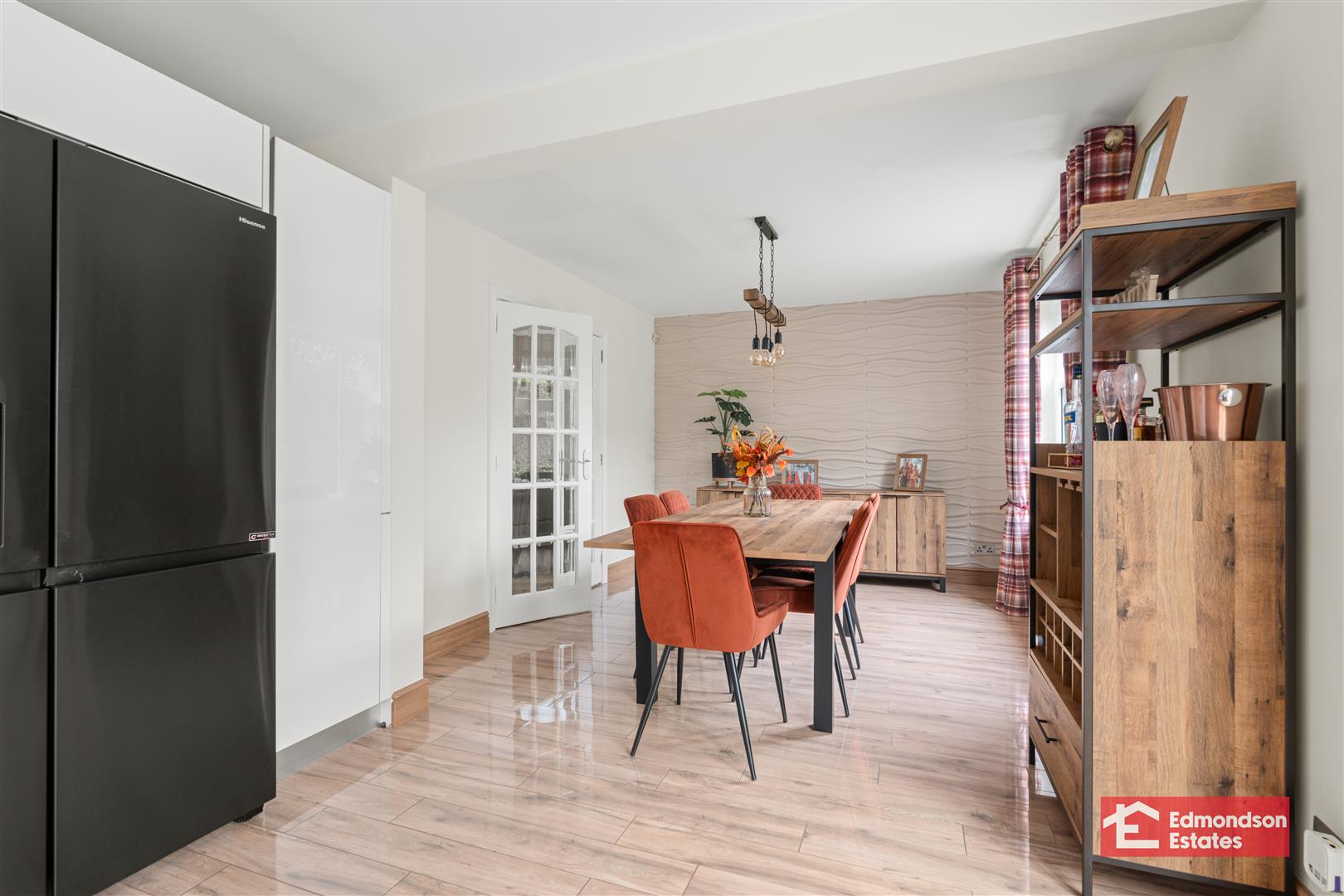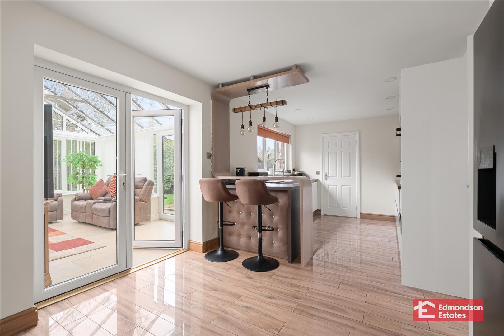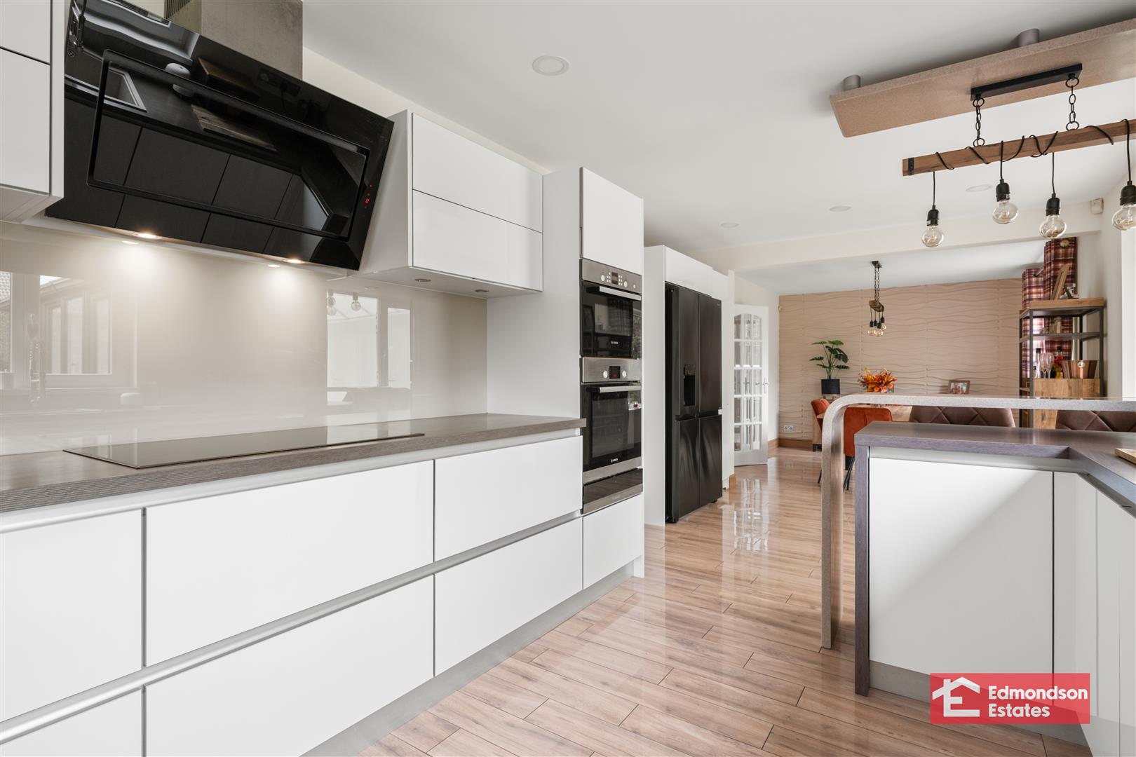 widest points. Modern fitted gloss style high and low level storage units and work surfaces. Composite 1.5 bowl sink unit. Breakfast bar area. Quality range of Bosch integrated appliances to include 5 ring induction hob with stainless steel extractor fan over, dishwasher, eye level microwave oven and separate oven. PVC double glazed French doors to sunroom. Tiled floor.