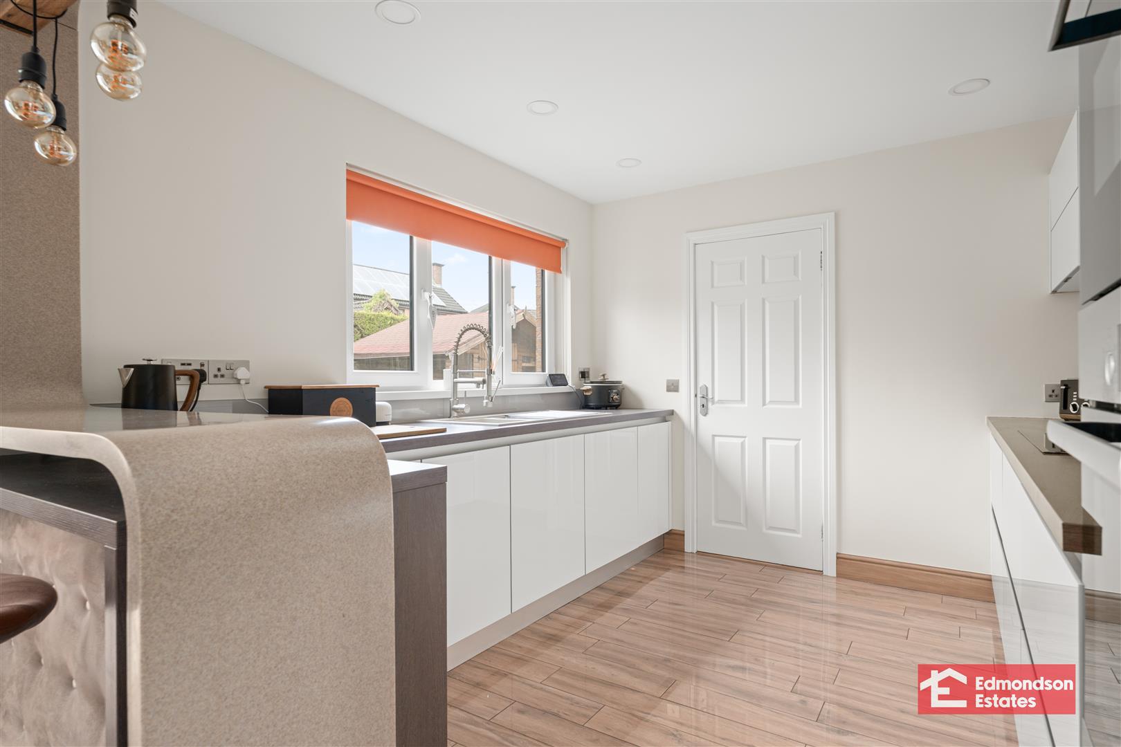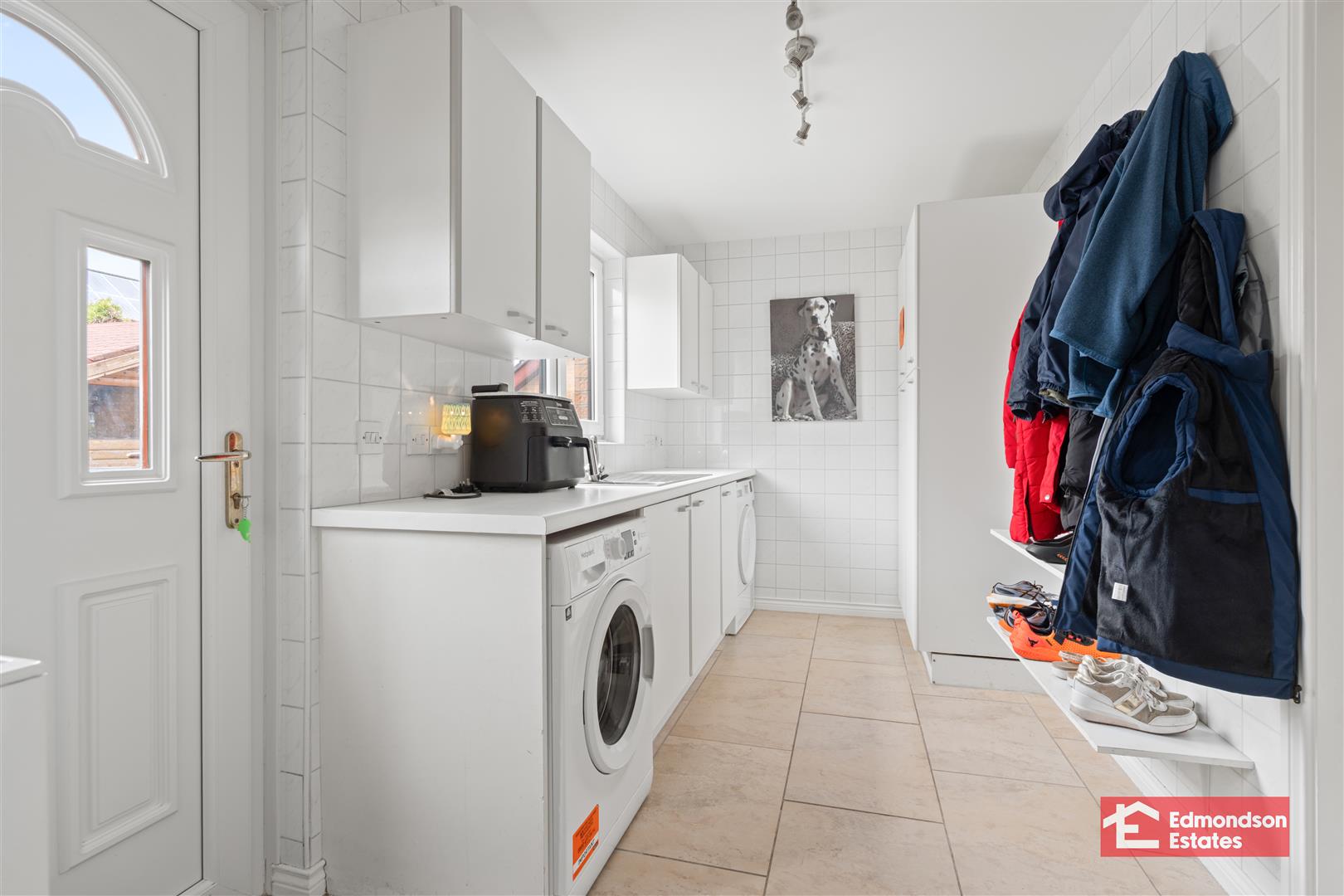 High and low level storage units and work surfaces. Stainless steel sink. Space for washing machine and tumble dryer. PVC double glazed rear door. Internal door to garage. Tiled floor.