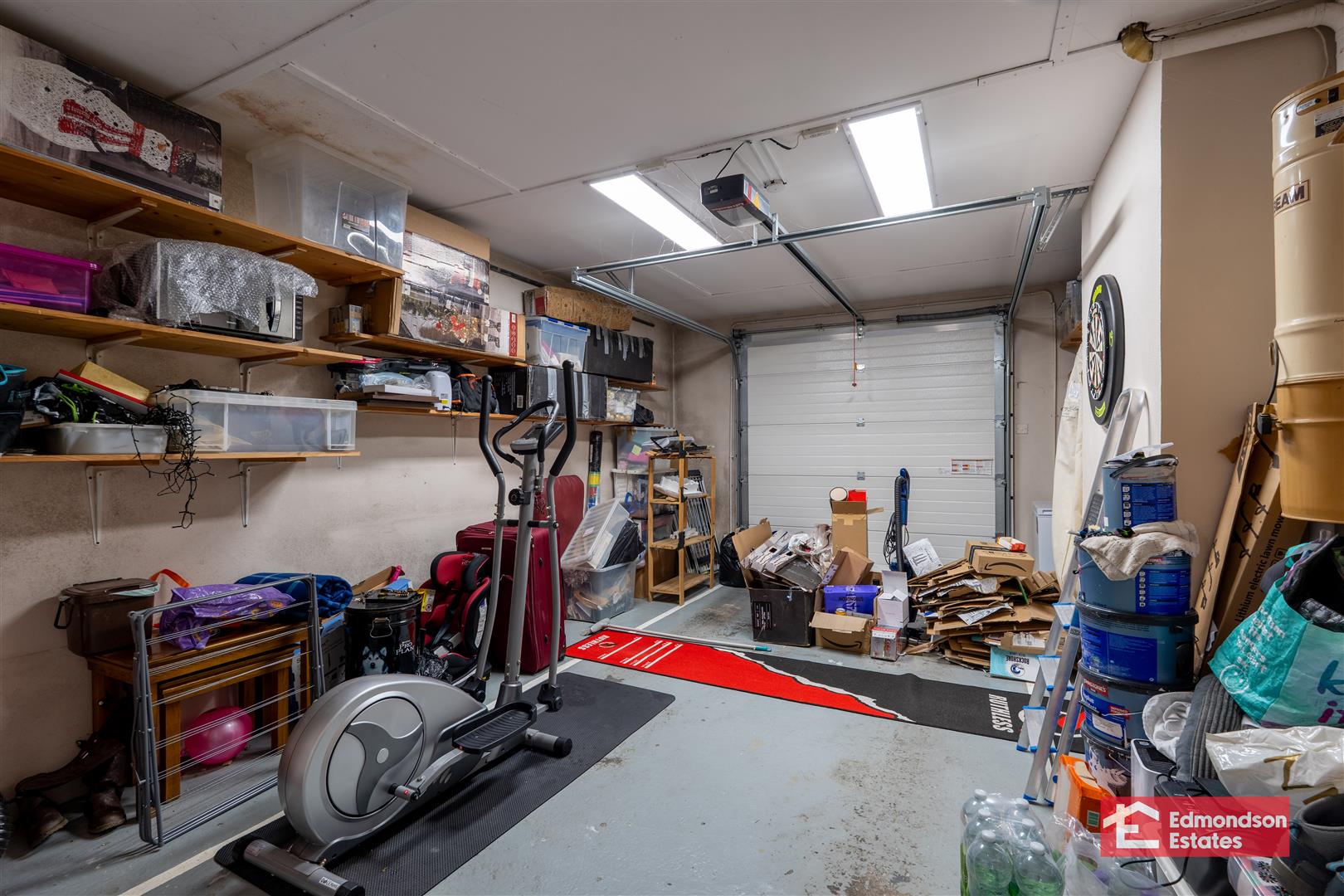 Electric up and over door. Concrete flooring. Oil fired central heating boiler (installed 2025). Power and light.