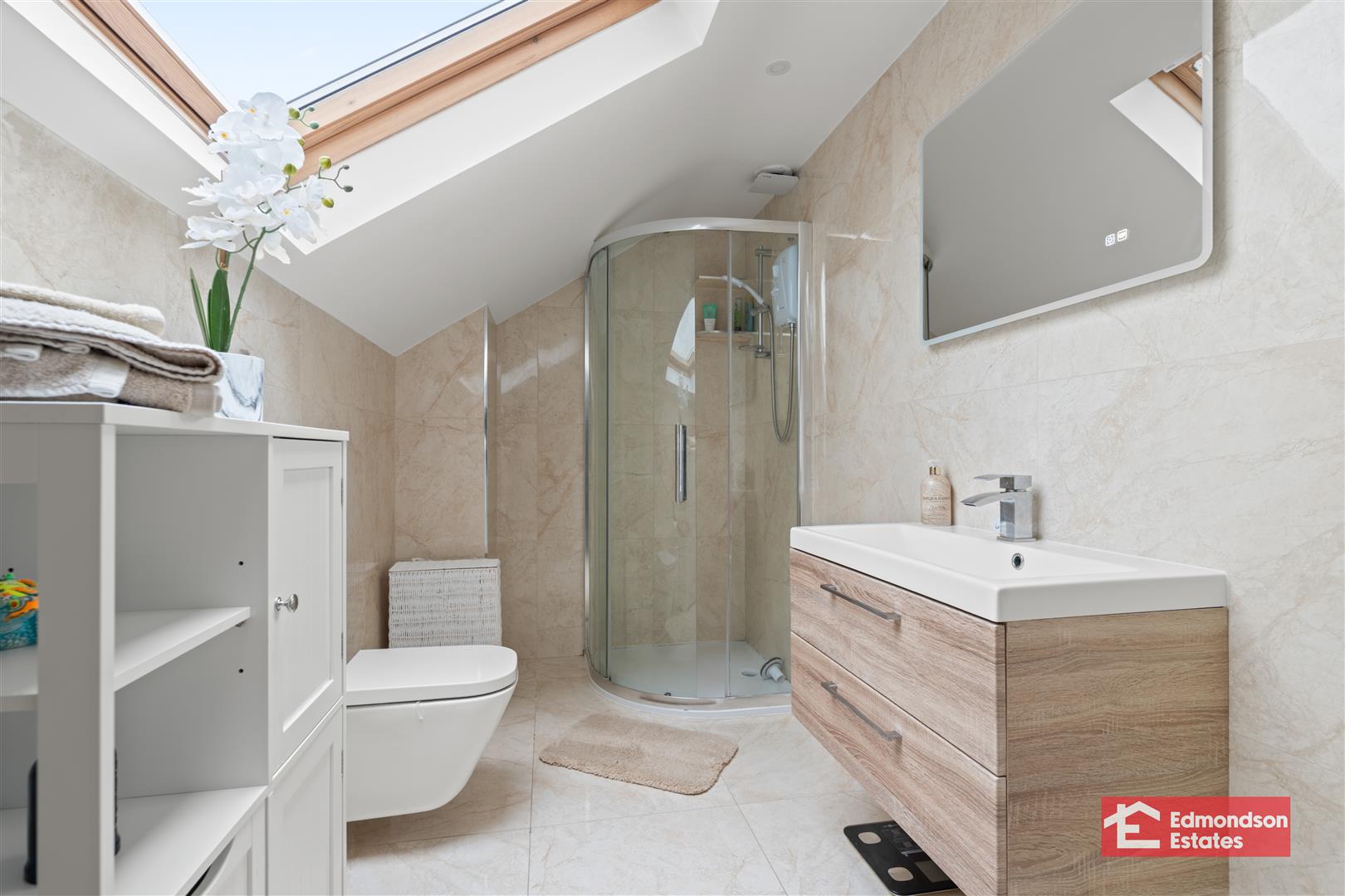 Modern fitted three piece suite comprising shower cubicle with electric shower over, floating vanity unit and concealed cistern WC. Fully tiled walls and tiled floor. Velux window. Towel radiator.