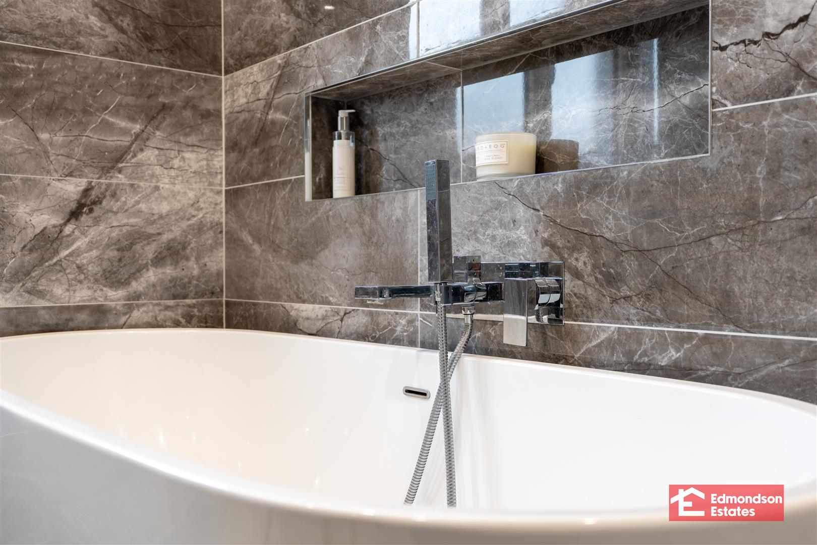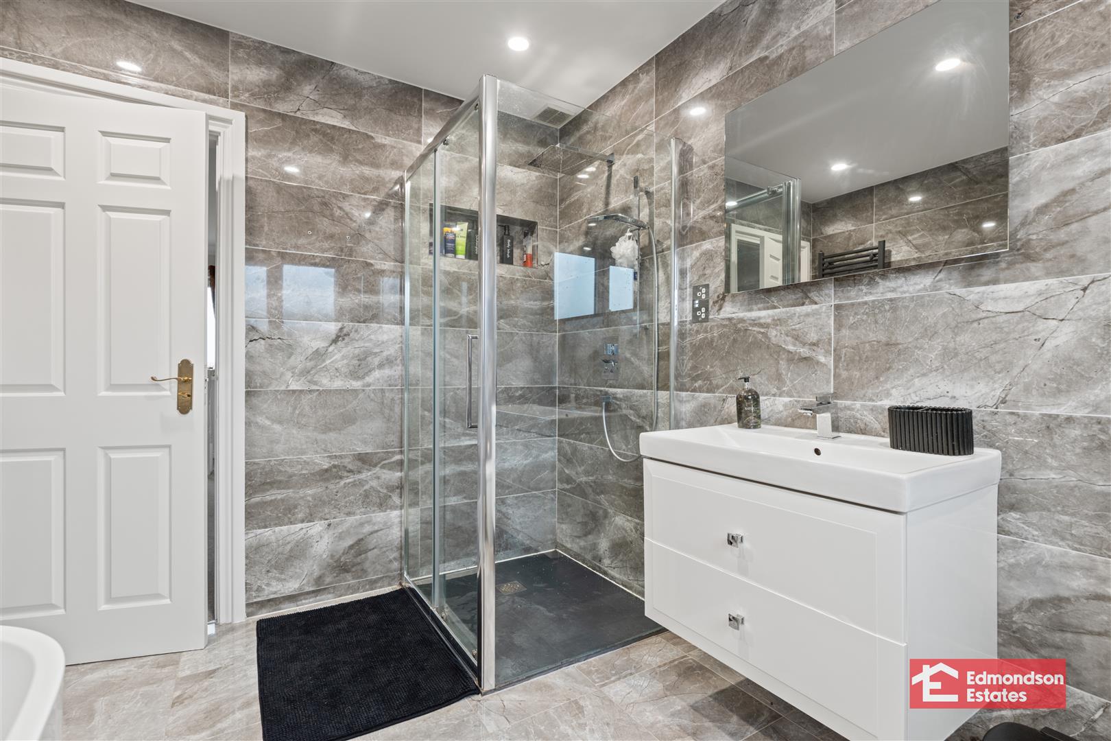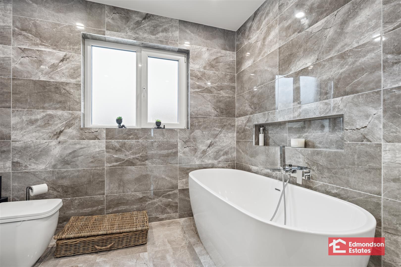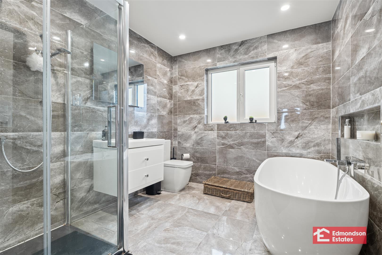 Modern fitted four piece suite comprising freestanding bath, shower enclosure with mains shower and drench shower head over, floating vanity unit and WC. Towel radiator. Fully tiled walls and tiled floor.