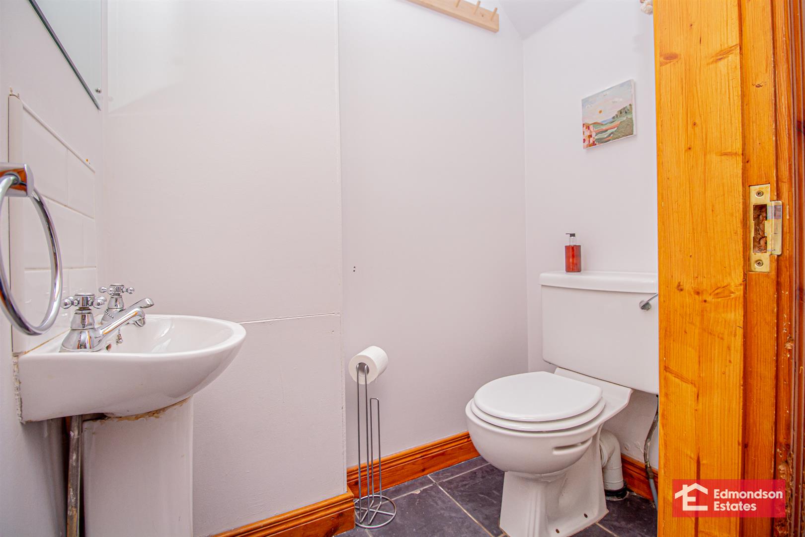 Fitted two piece suite comprising wash hand basin and WC. Tiled floor.