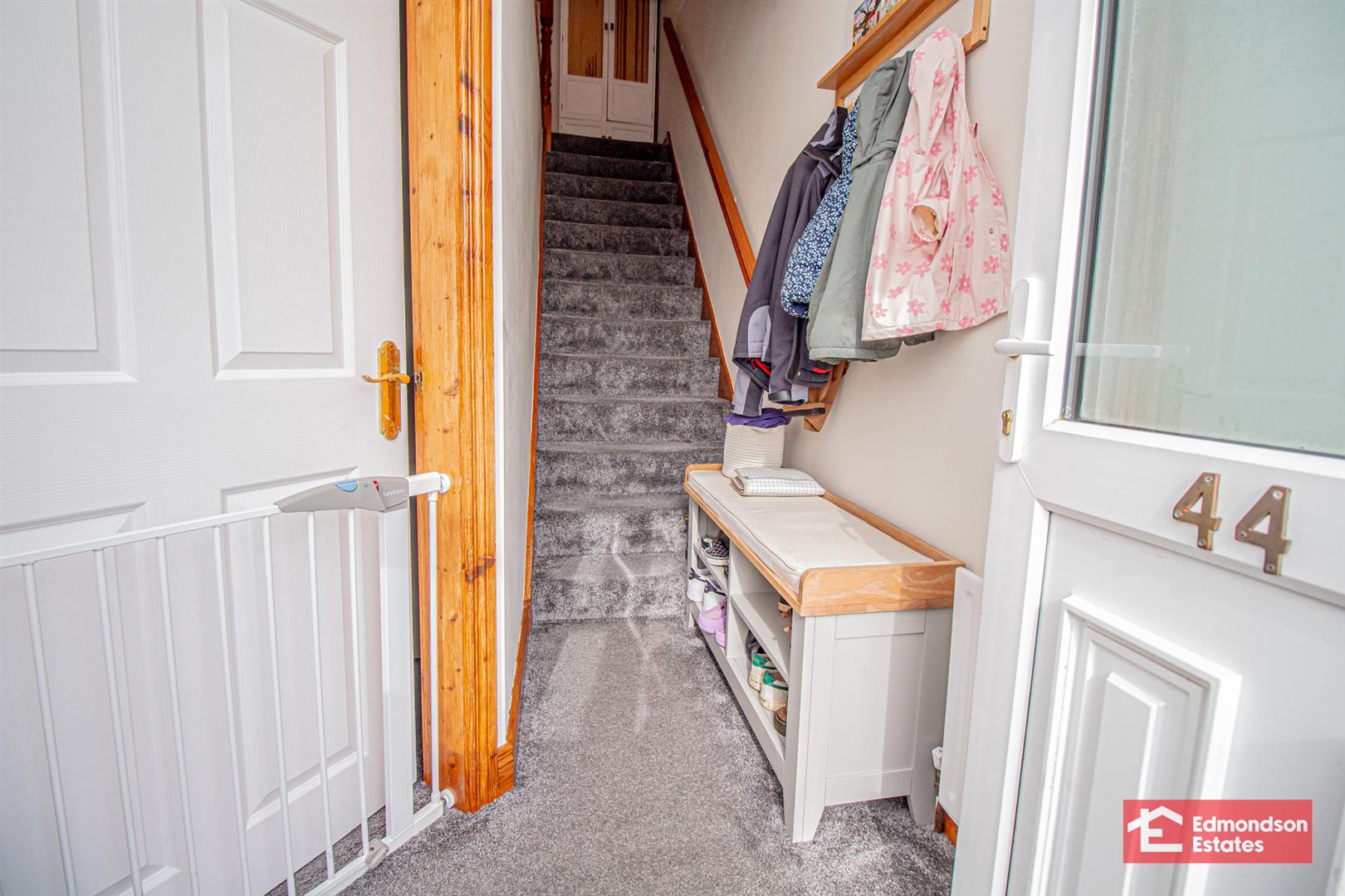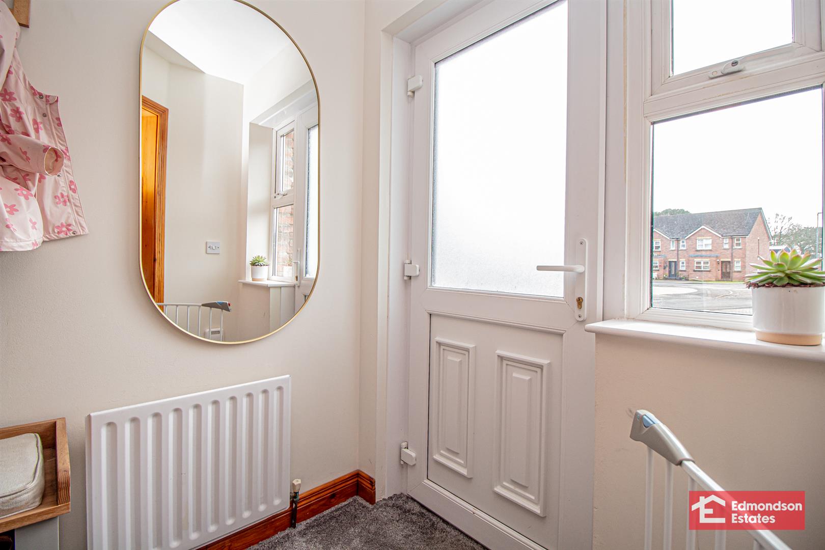 PVC double glazed front door. Stairwell to first floor.