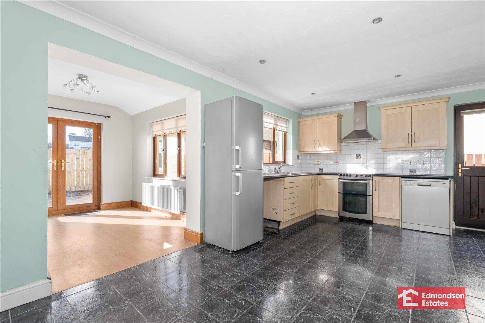 High and low level units with stainless steel sink. Tiled splash back. Space for cooker. Plumbed and space for washing machine and dishwasher. Side door. Tiled flooring. Space for large family dining table.