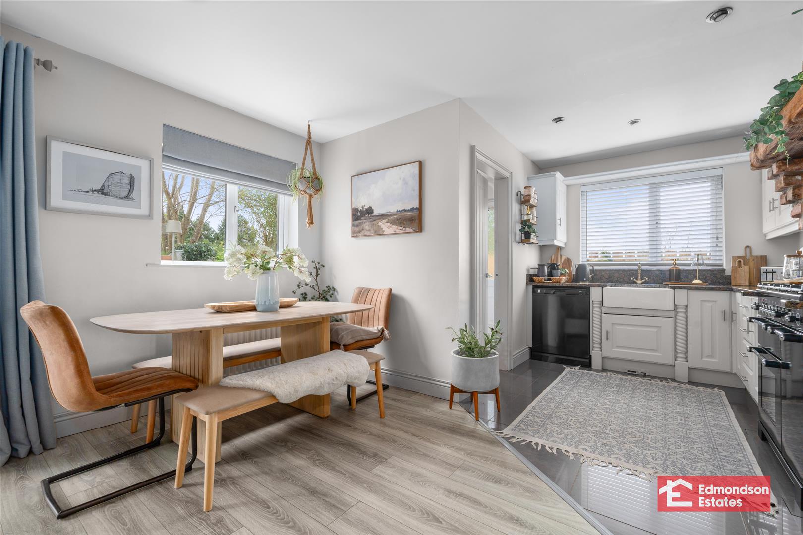 Double patio doors to rear gardens. Painted high and low level units with granite worktops. Range cooker with brick Inglenook . Belfast Sink. Integrated dishwasher. Multi fuel stove in living area. Space for large family dining table.