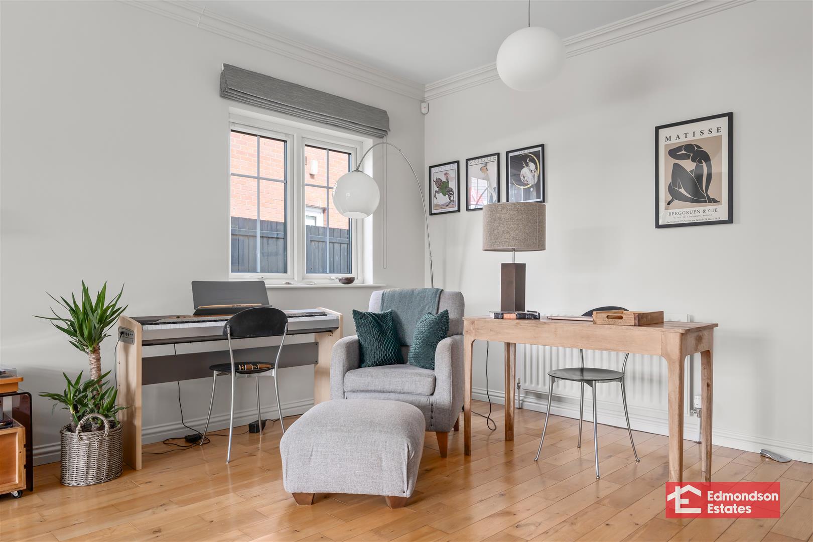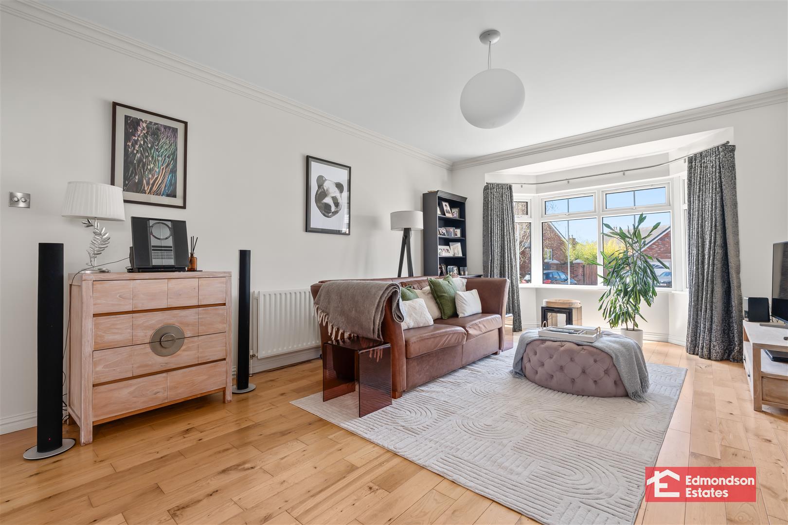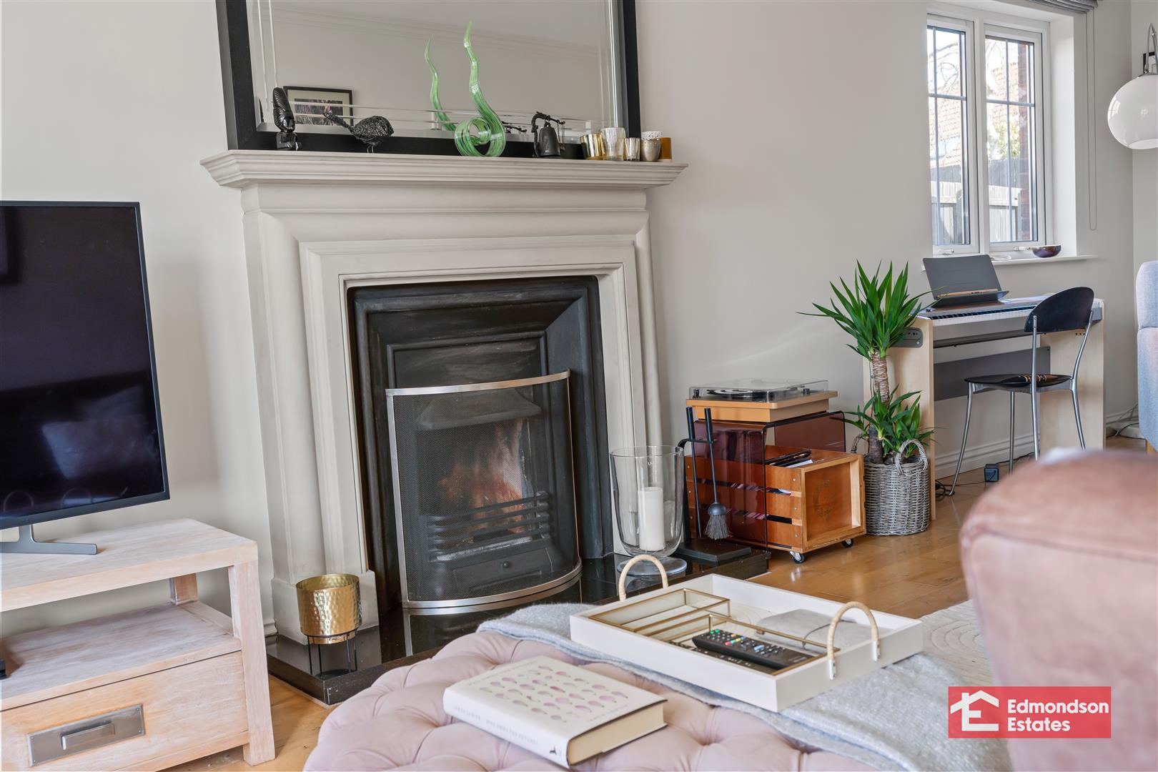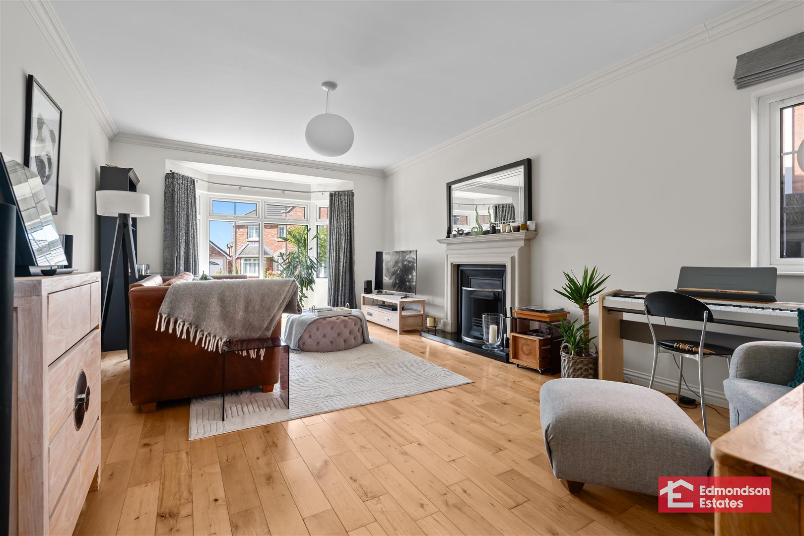 Hardwood glazed double doors. Solid wood flooring. Focal point open fire with composite surround and granite hearth. Bow bay window to front elevation.