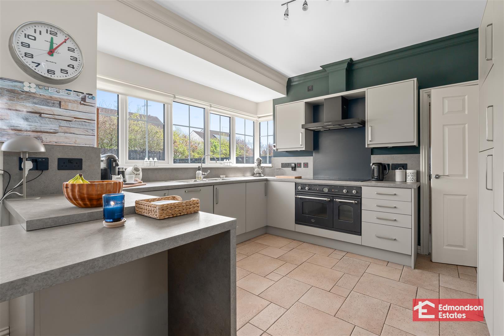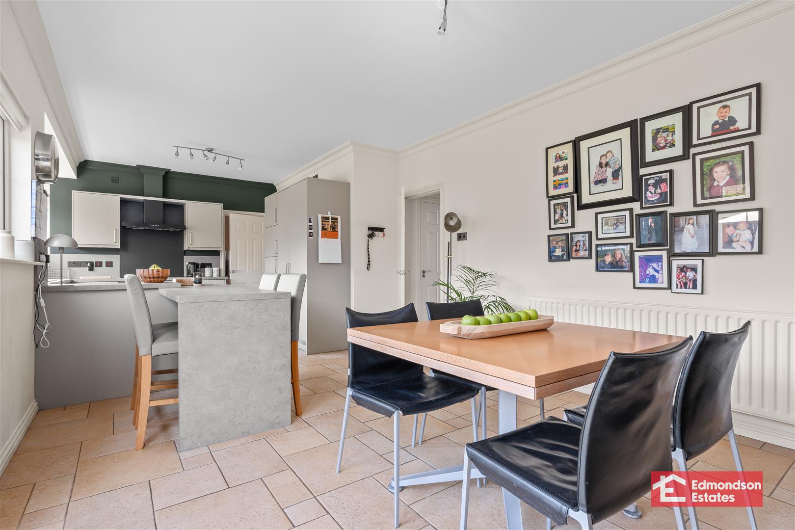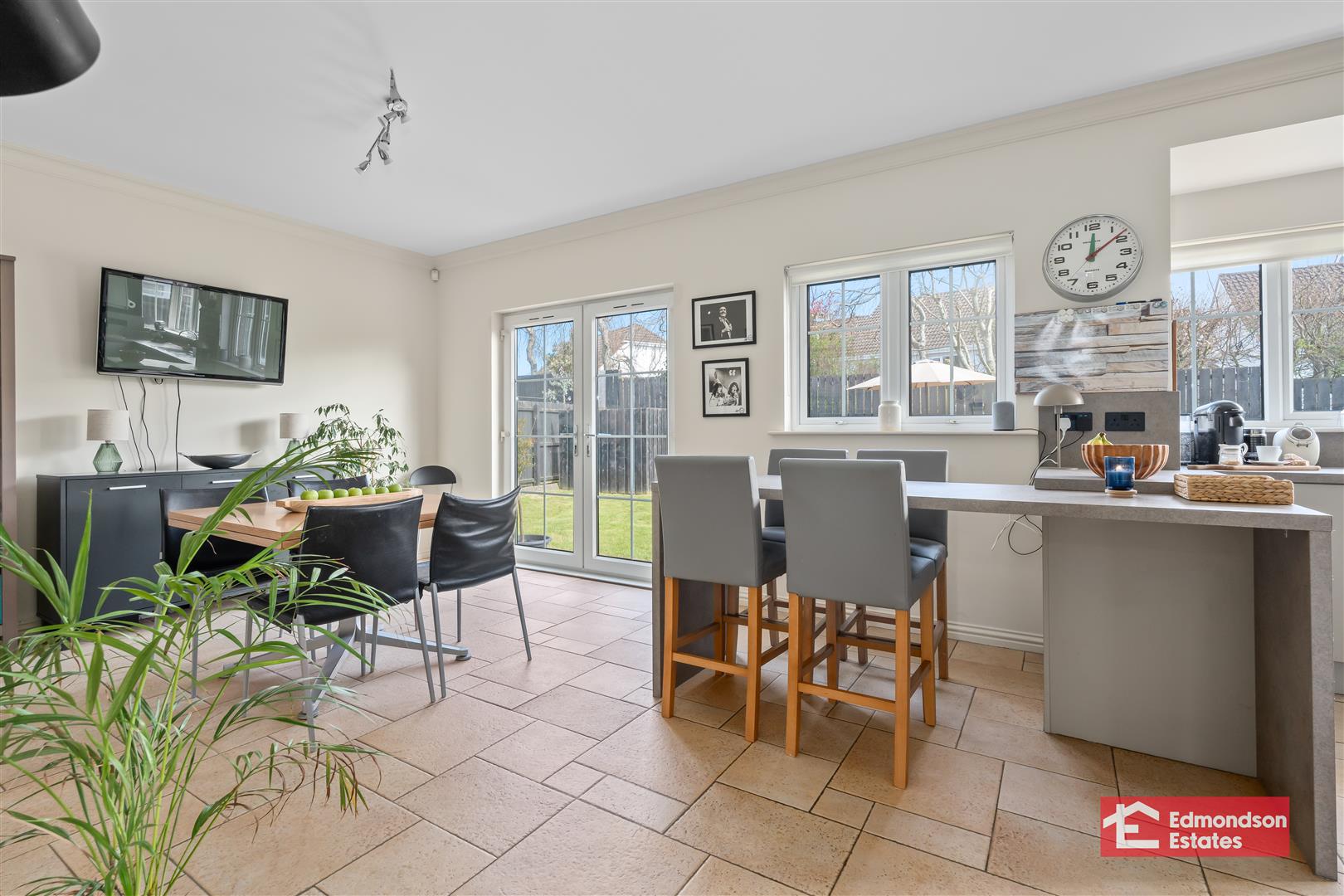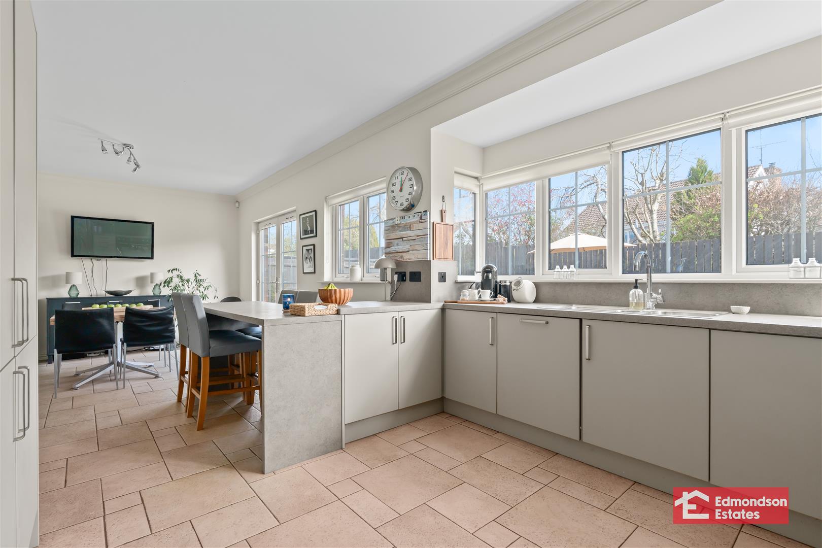 widest points. Modern fitted kitchen with high and low level storage units and work surfaces. Breakfast bar area. Stainless steel 1.5 bowl sink unit. Integrated appliances to include fridge freezer, dishwasher, 5 ring electric hob and over with black stainless steel extractor fan over. PVC double glazed French doors to garden. Tiled floor.