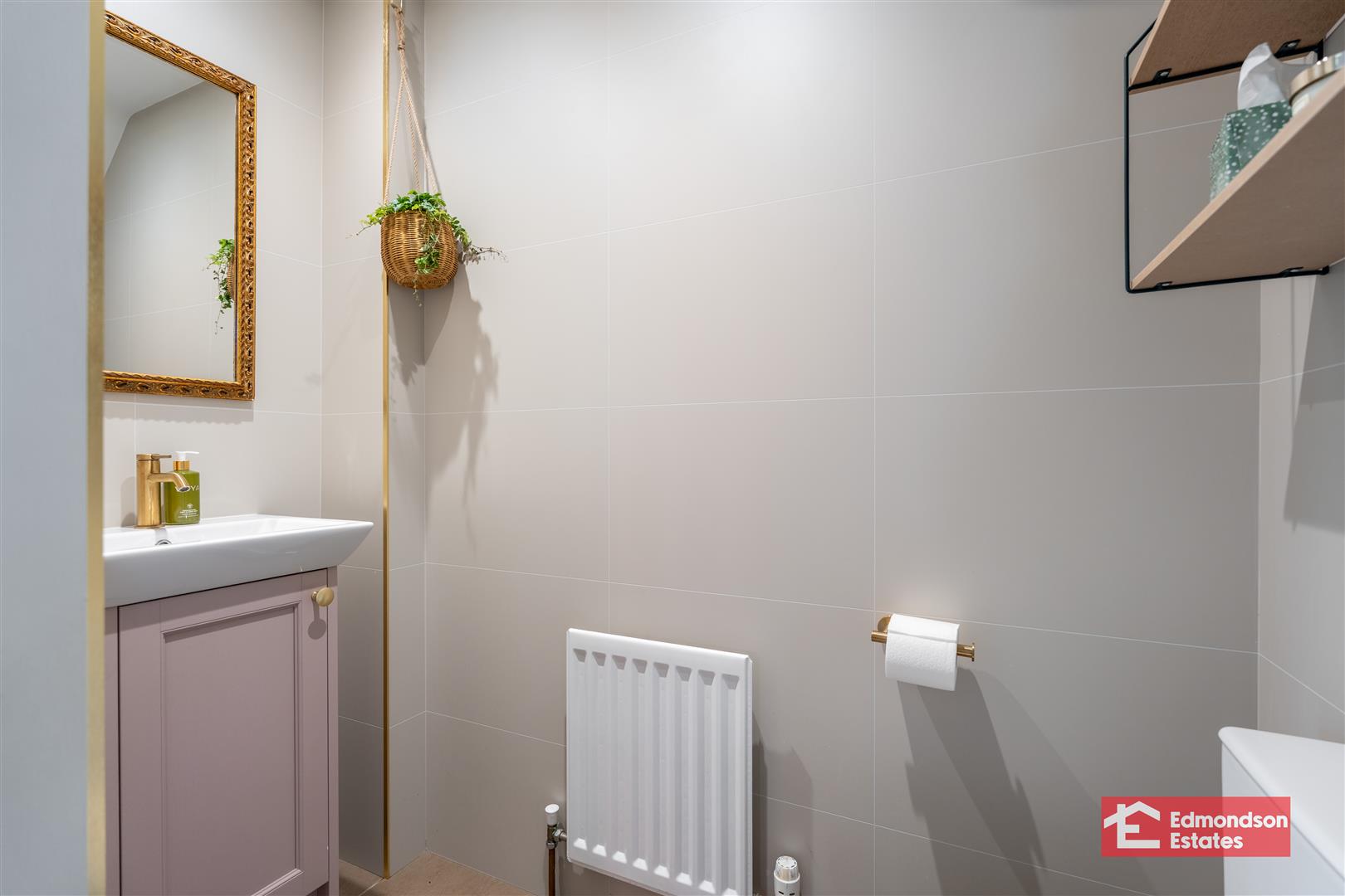 Modern fitted two piece suite comprising vanity unit and WC. Tiled floor.