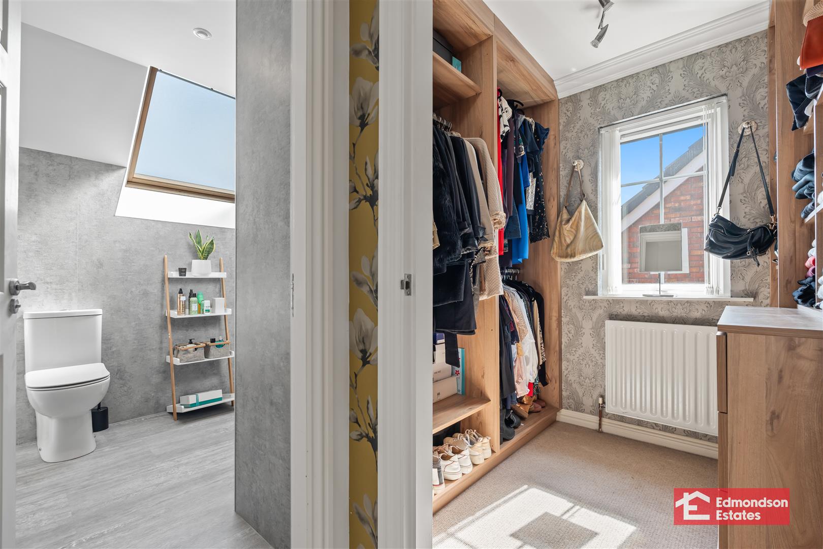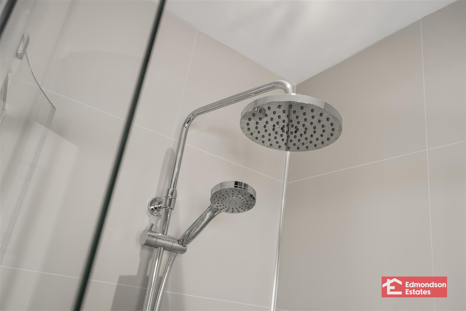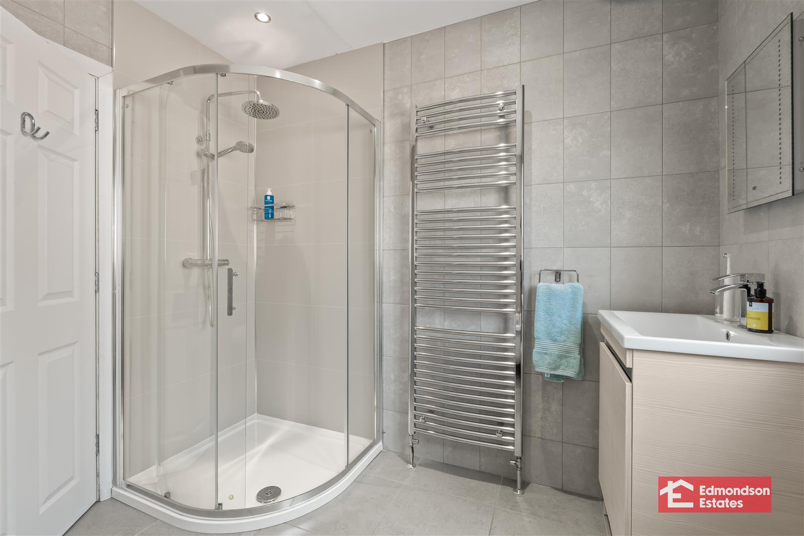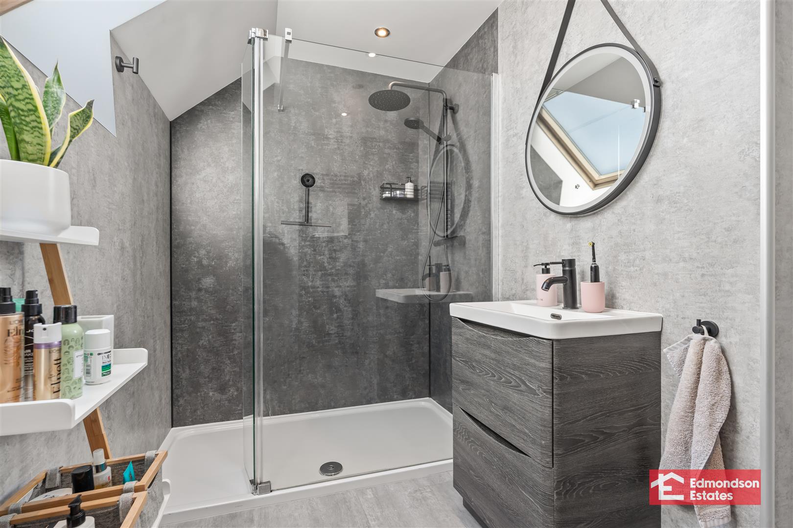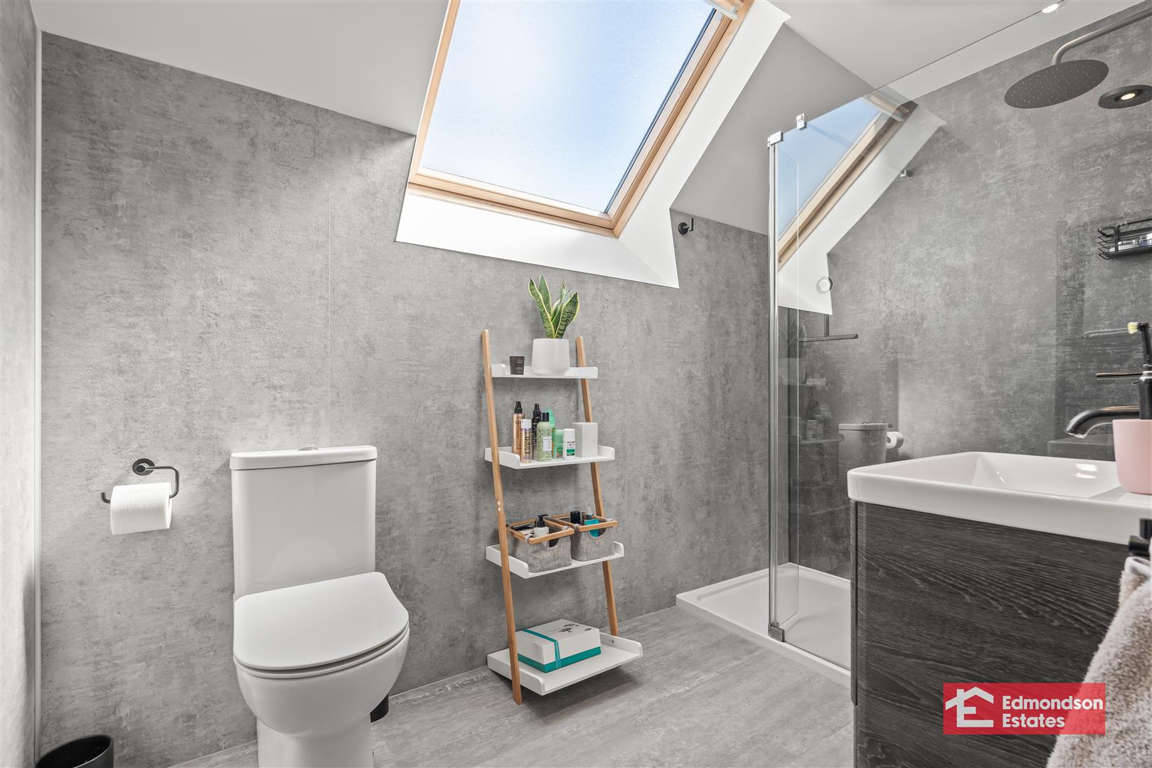 Deluxe modern fitted three piece suite comprising shower enclosure with mains shower and drench head over, vanity unit and WC. Chrome towel radiator. Fully panelled walls. Velux window.