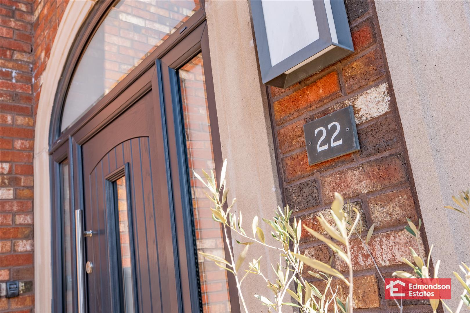 PVC composite front door with matching side screens and fan light over. Tiled floor. Stairwell to first floor.