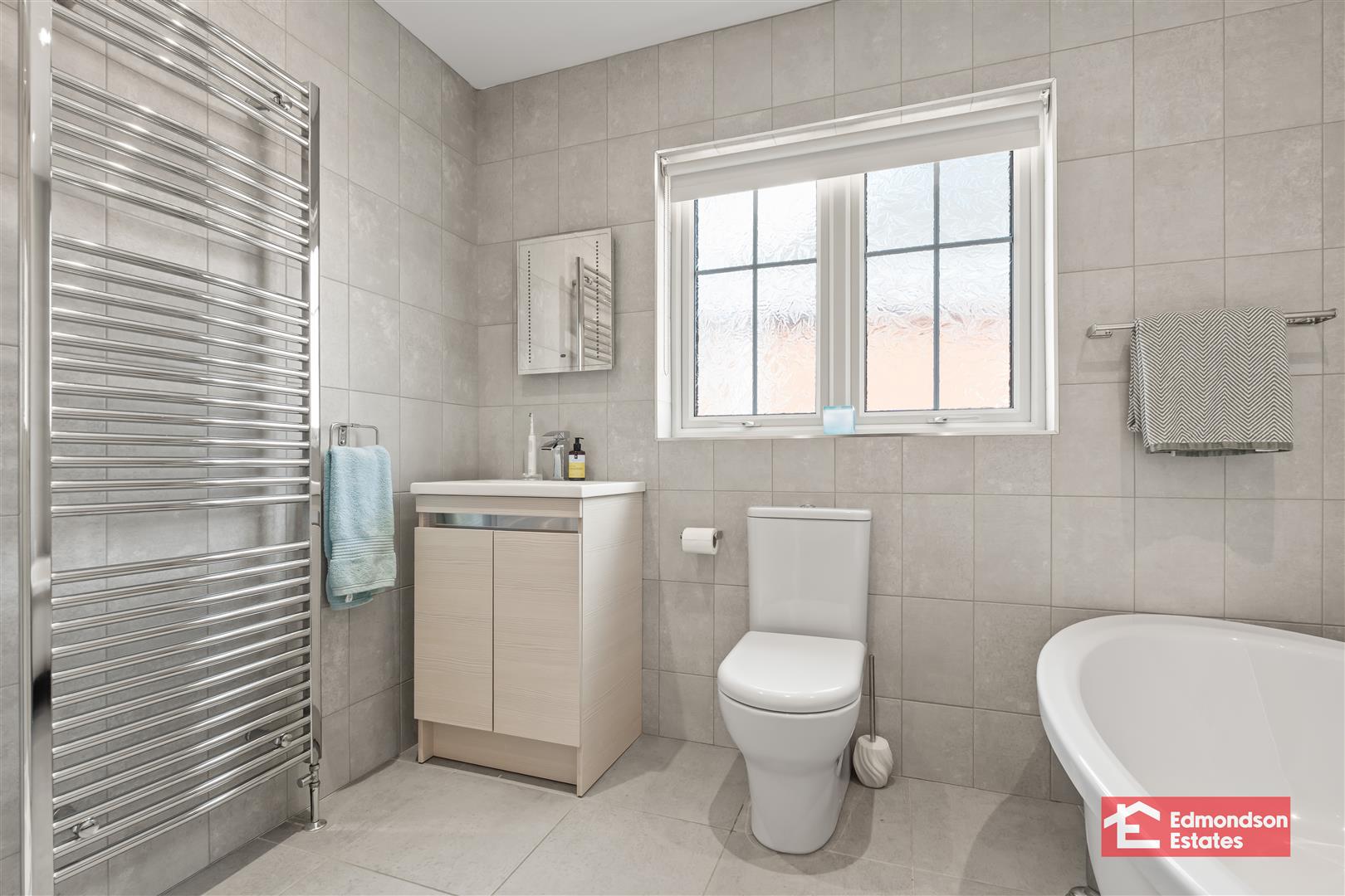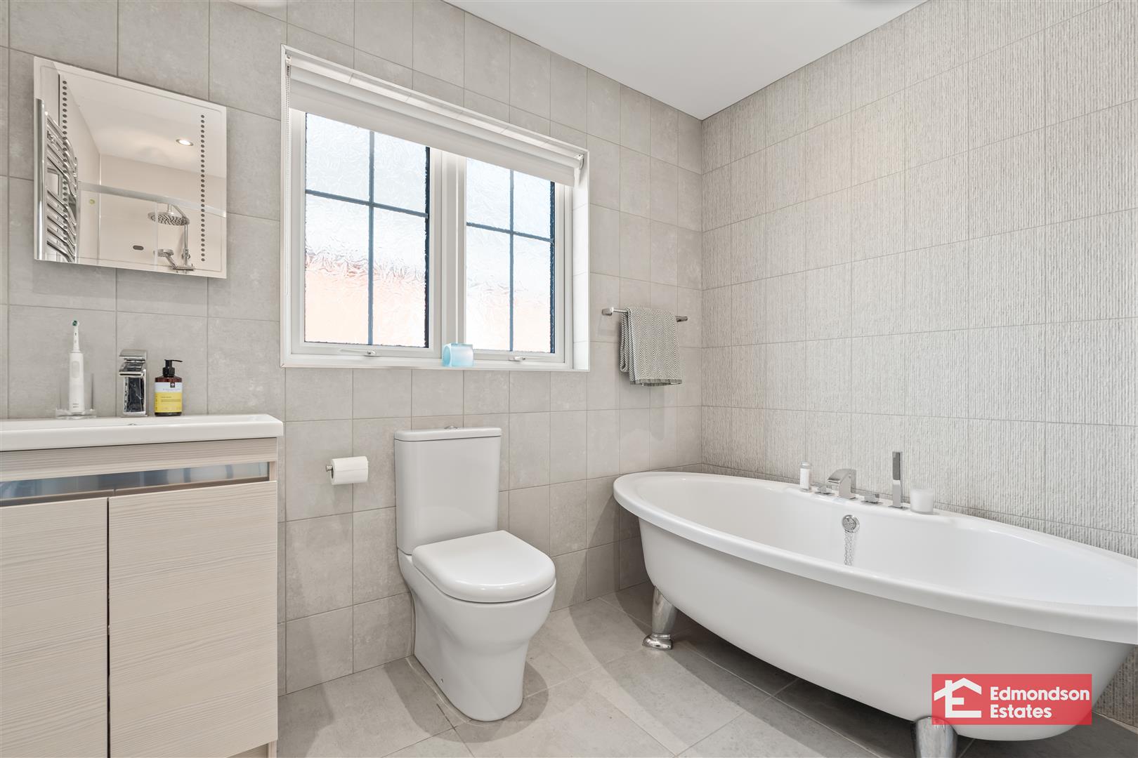 Modern fitted four piece suite comprising free standing bath, shower cubicle with mains shower and drench head over, vanity unit and WC. Chrome towel radiator. Fully tiled walls and tiled floor.