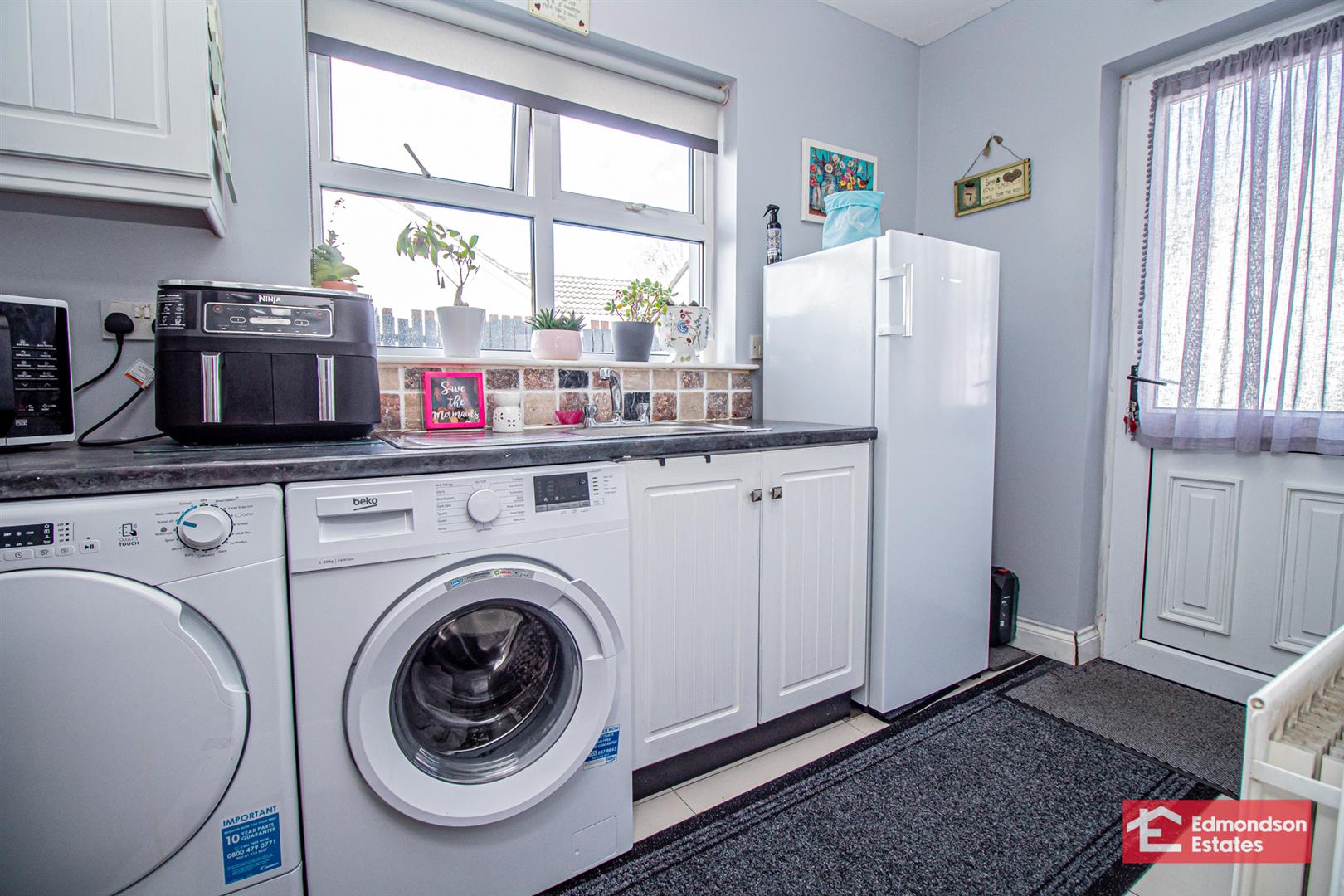 High and low level storage units and work surfaces. Stainless steel sink unit. Space and plumbing for appliances. PVC double glazed rear door. Tiled floor.