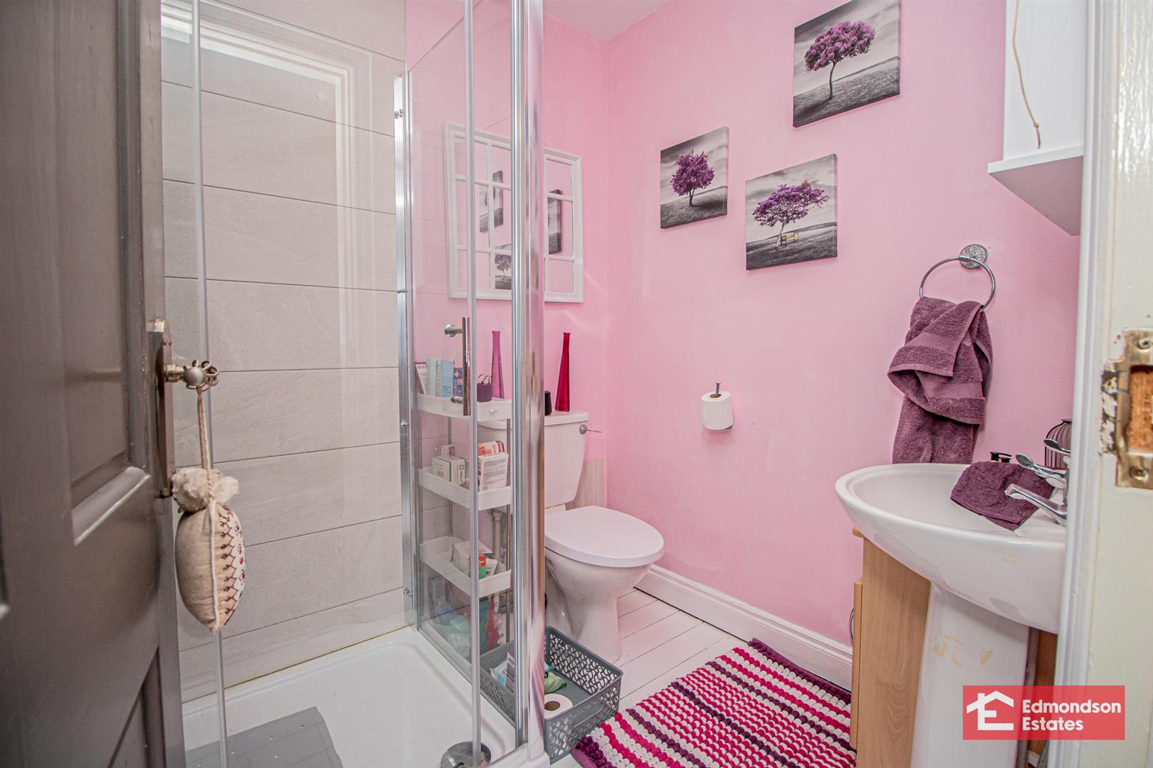 Fitted three piece suite comprising shower cubicle with electric shower over, wash hand basin and WC. Tiled walls to shower.