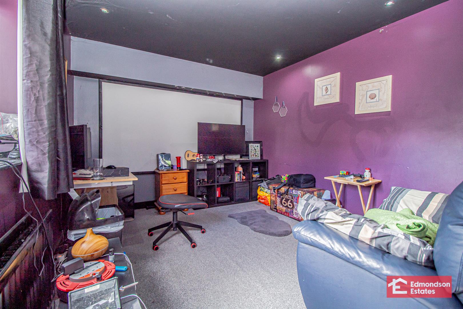 Roller shutter door. PVC double glazed service door. Oil fired central heating boiler (housed). (Currently partitioned and utilised as a games/TV room).
