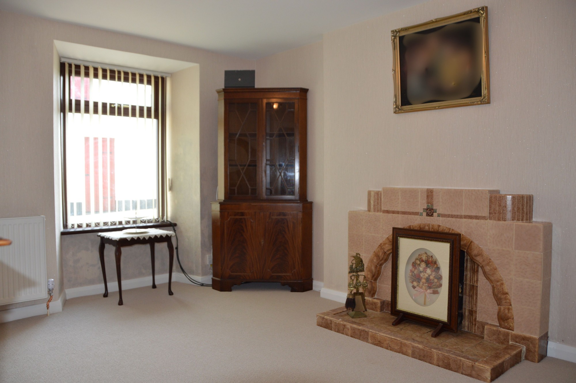 Fireplace with mahogany surround, connecting door to kitchen, cornice, wall lights, T.V. point and radiator.