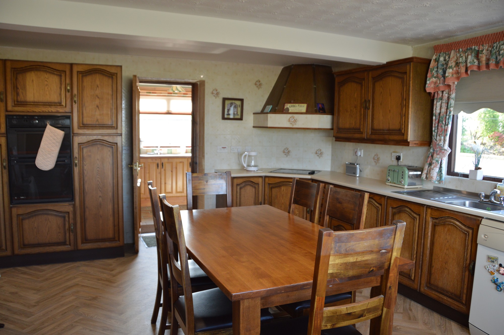 Fitted kitchen suite with range of high and low level oak cupboards, sink with double drainer, integral ceramic hob and oven, plumbed for dishwasher, radiator and good space for casual dining.