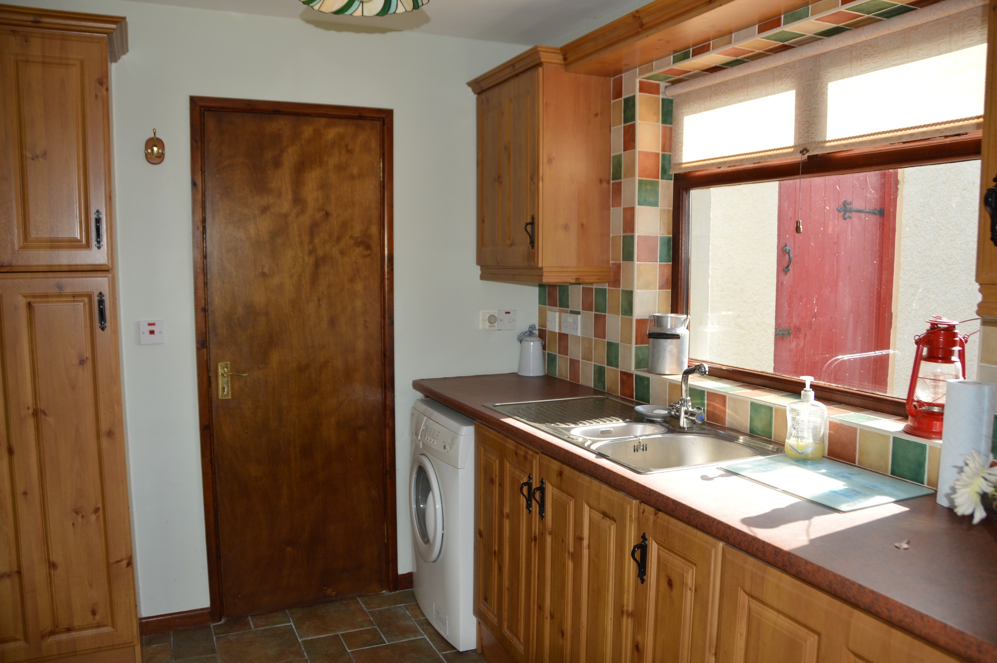 1 ½ bowl stainless steel sink unit, high and low level units, plumbed for washing machine, PVC external rear door.