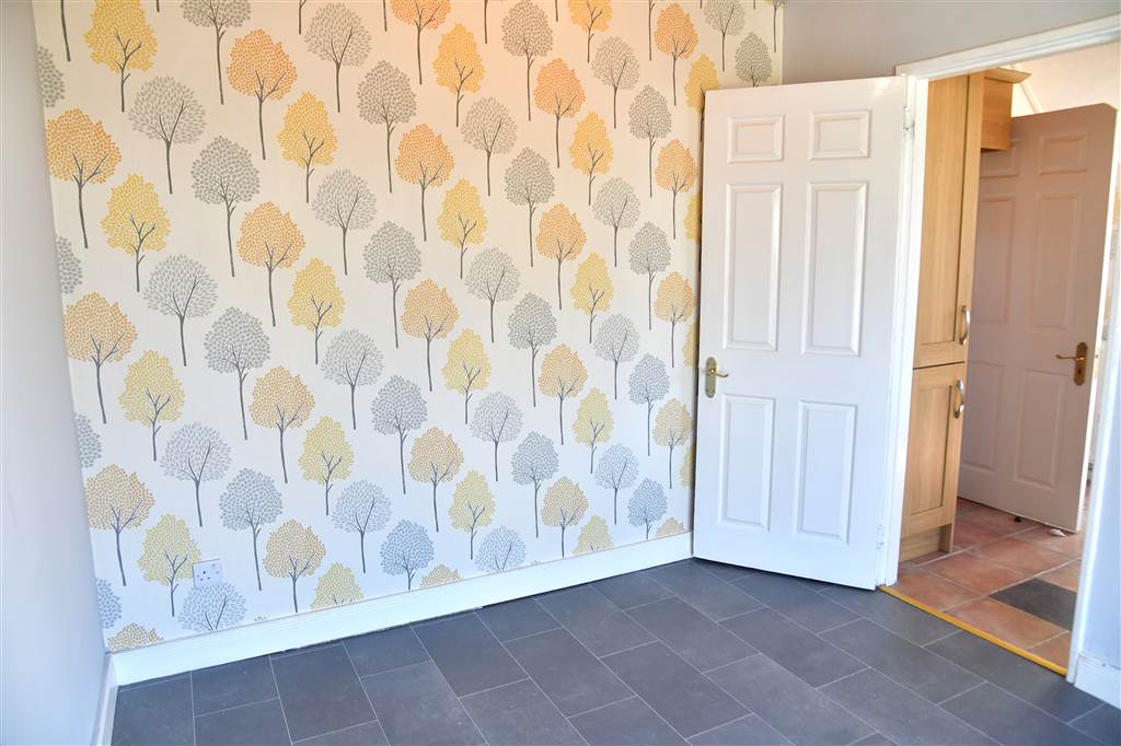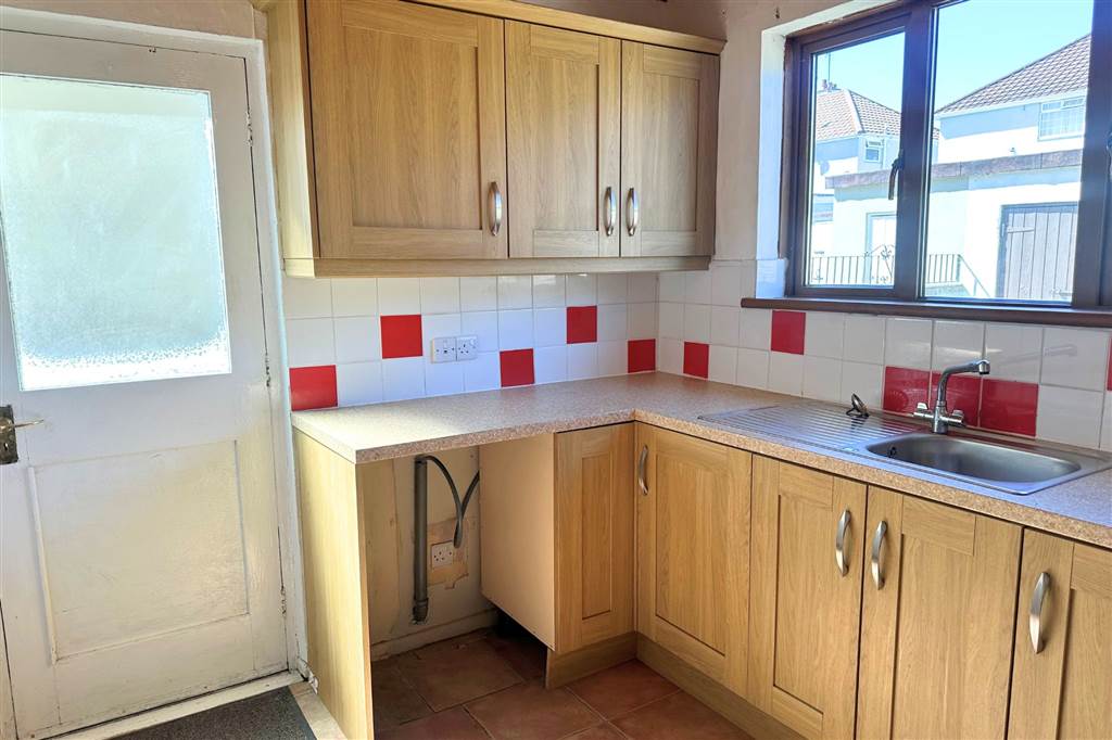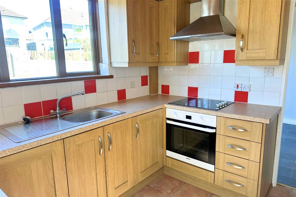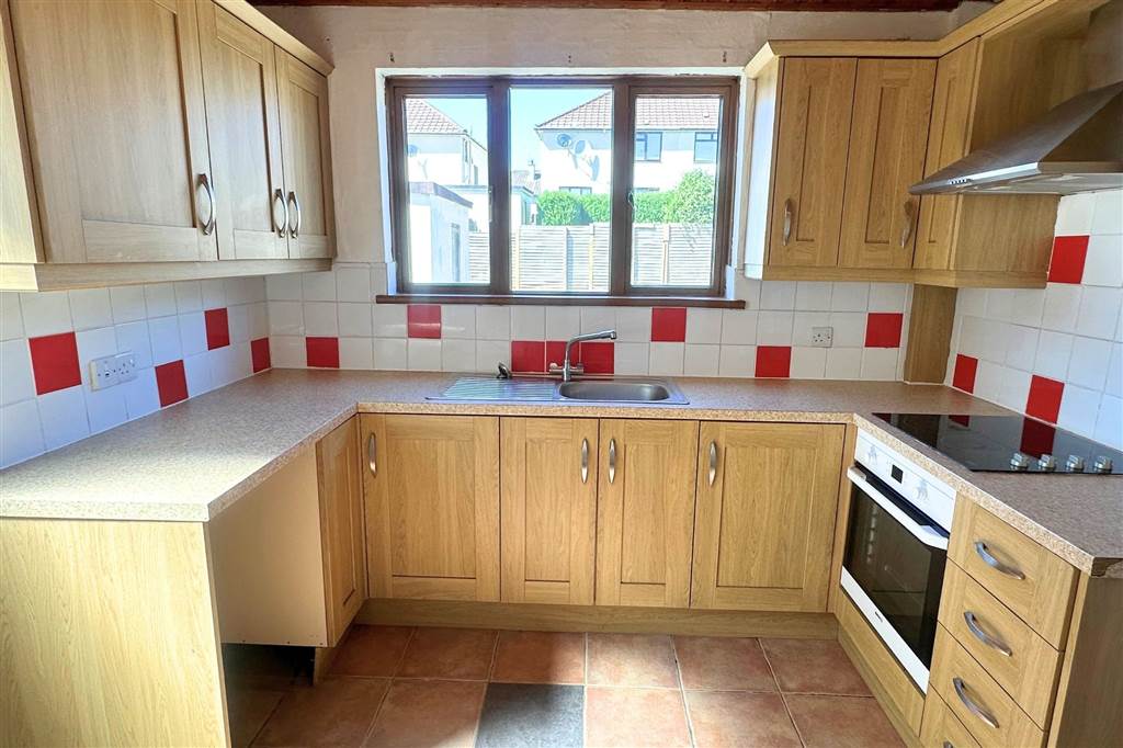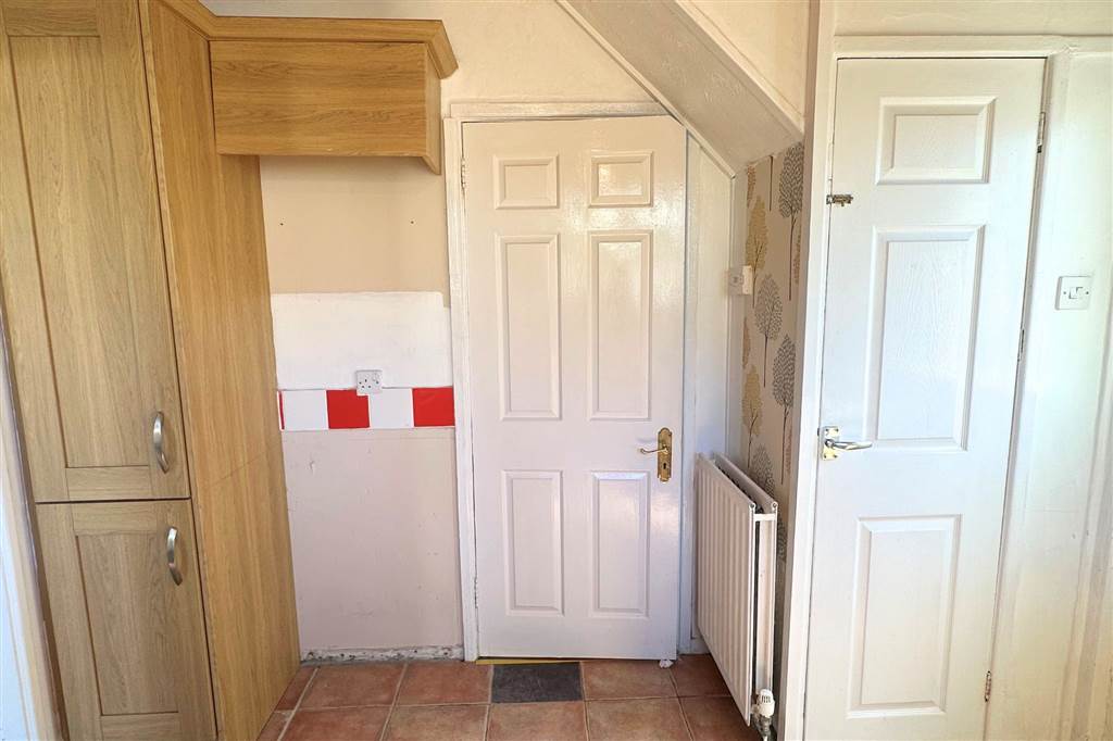 With a range of eye and low-level fitted units, stainless-steel sink unit and drainer with stainless-steel mixer tap. Integrated four ring electric hob and oven with stainless-steel extractor fan over. Plumbed for washing machine. Space for fridge-freezer. Cutlery drawers. Under stair storage cupboard. Splash back tiling. Tiled flooring. Hardwood door to rear.