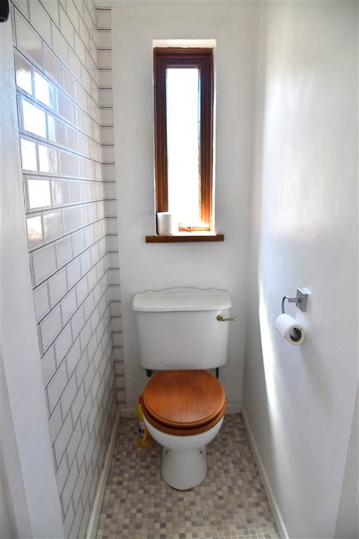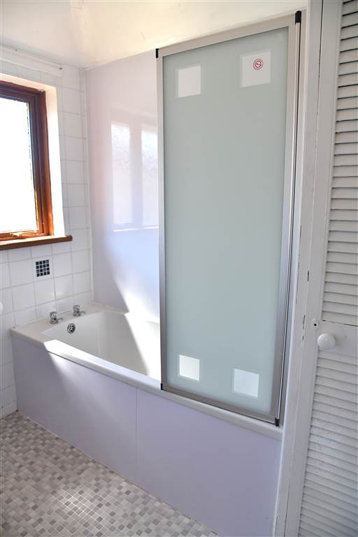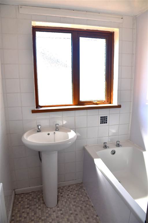 With WHB and panelled bath with shower over. Splash back tiling. Hot-press with shelved storage.