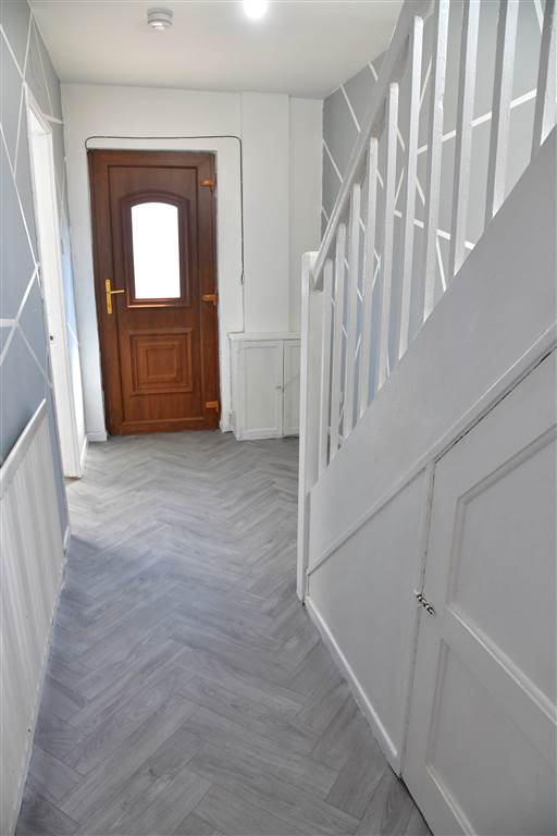 With PVC front door with glazed pane. Balustrade staircase to first floor. Under stair storage cupboard.
