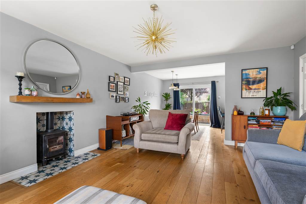 With wood burning stove to tiled inset and hearth. Solid wooden flooring.