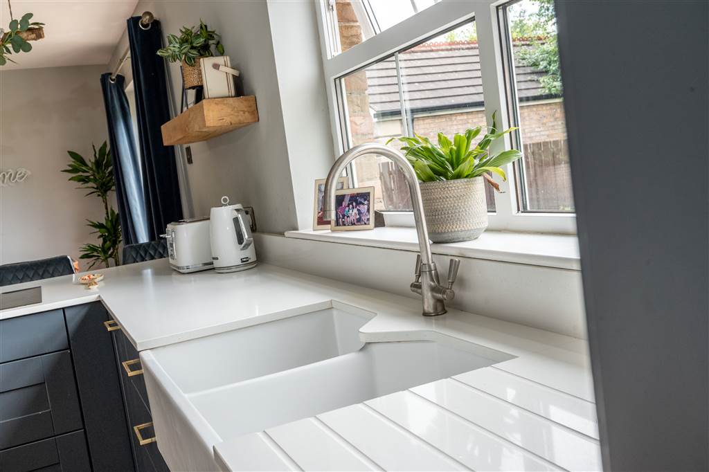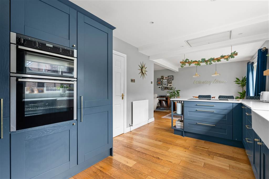 With a range of eye and low level fitted units with chrome handles and Quartz worktop. Double ceramic sink with stainless steel mixer tap. Breakfast bar area with seating. Integrated double oven. Integrated fridge, integrated freezer, integrated dishwasher. Saucepan drawers. Recessed lighting. Open plan to dining area and Living room.
