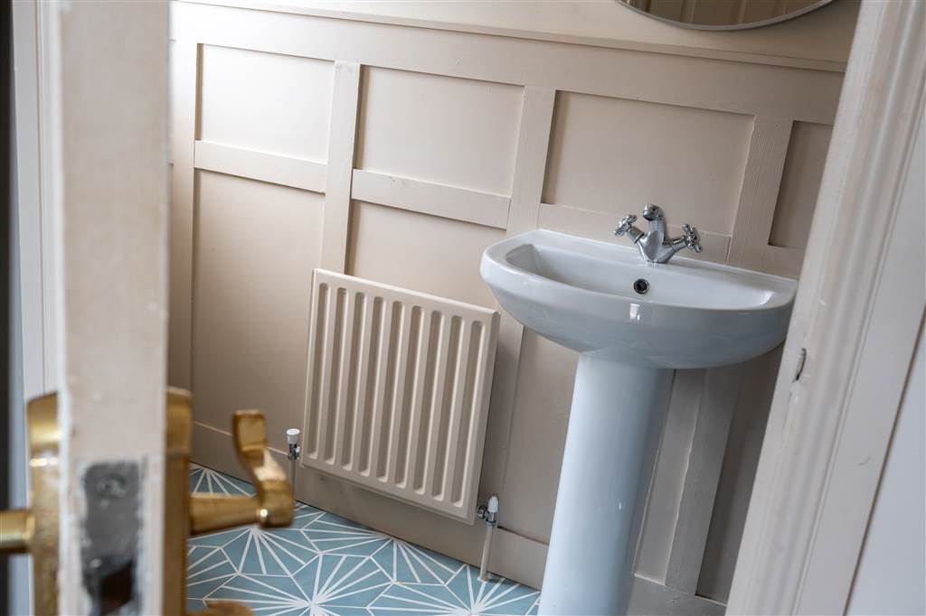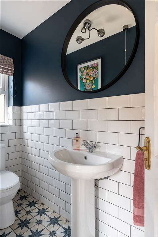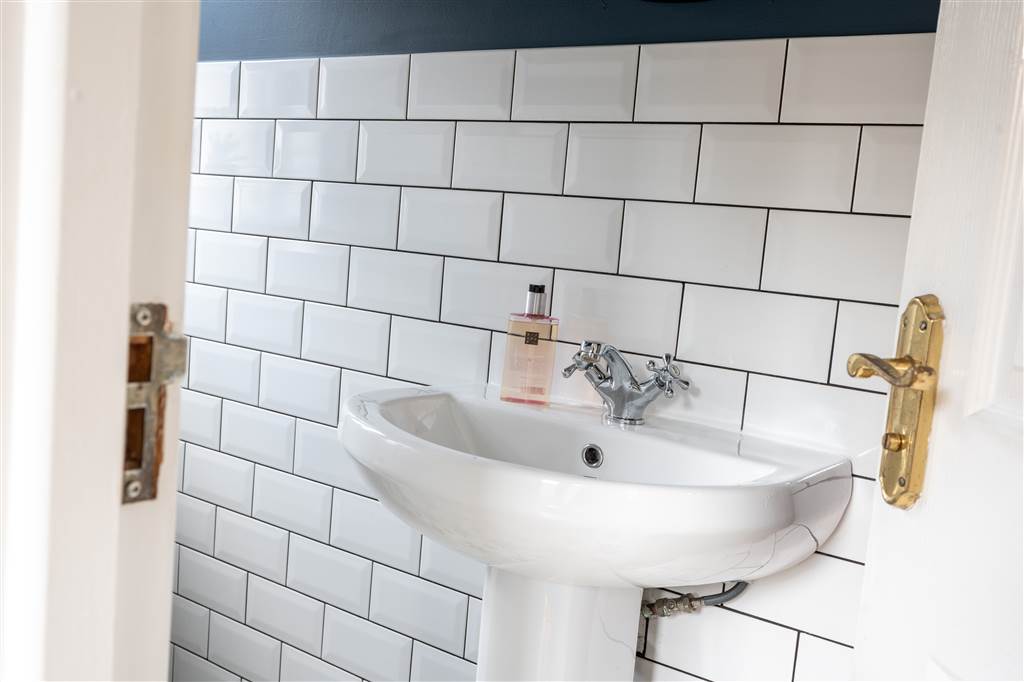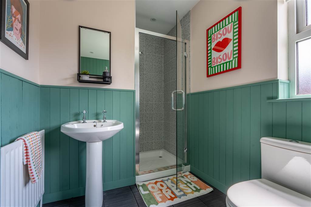 With 3 piece white suite comprising LFWC, WHB and Mira shower to enclosed tiled corner cubicle. Splash back tiling. Tiled flooring.