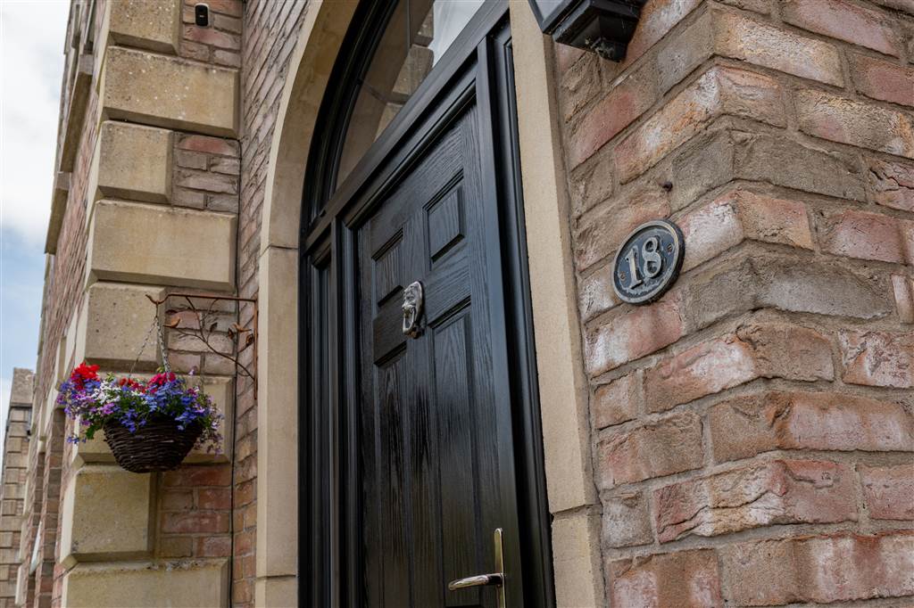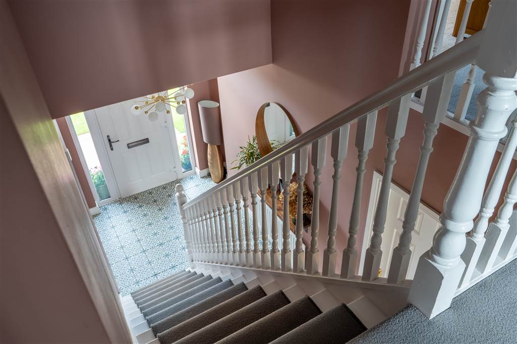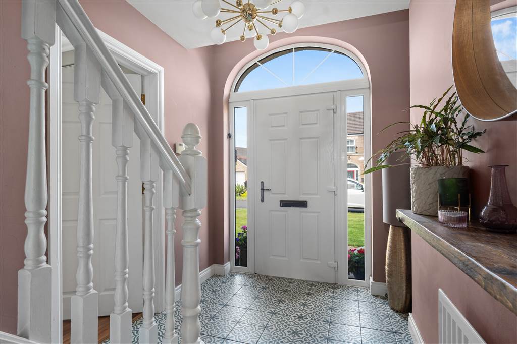 With PVC front door and side panes. Balustrade stair case to first floor. Tiled flooring. Under stair storage cupboard.