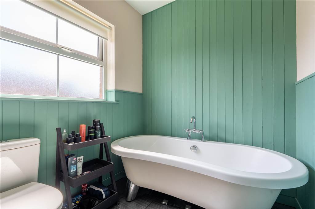 With 4 piece white suite comprising LFWC, WHB, shower to enclosed tiled corner cubicle. Free standing bath. Panelling to walls. Tiled flooring.